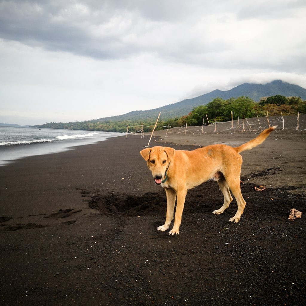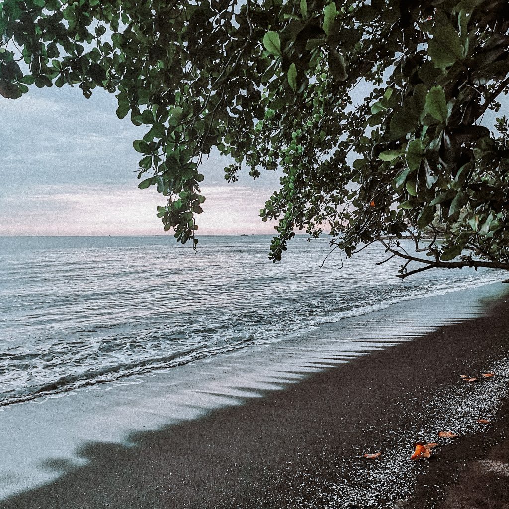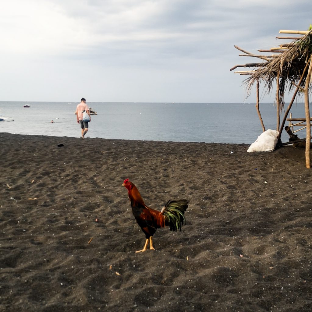 Wir werden unser Gepäck los und machen uns direkt auf dem Weg zum Strand. Wir können es nicht erwarten, endlich im Meer schwimmen zu gehen. Davon haben wir ehrlicher Weise schon in Indien geträumt. Wir müssen nur einmal um unser Guesthouse herumgehen, einem kleinen Weg folgen und keine 5 Minuten später sind wir da: am schwarzen Strand. Der Sand ist tatsächlich schwarz und auch das Meer wirkt auf den ersten Blick etwas düsterer als an einem weißen Sandstrand. Statt von Kieler Möwen werden wir von zwei Hähnen begrüßt. Warum auch nicht und als dann noch ein süßer Hund hinzukommt, sind wir noch ein kleines bisschen glücklicher. Jetzt aber ab ins Wasser. Konsti ist hocherfreut, endlich wieder im Salzwasser zu planschen und Caro braucht aufgrund der warmen Wassertemperaturen ausnahmsweise keine Ewigkeit bis sie im Wasser ist. Außer uns sind nur noch ein paar Kinder am Strand. Aus dem Wasser schauen wir wieder auf den grünen und dicht bewachsenen Nationalpark, ein wirklich schönes Bild.