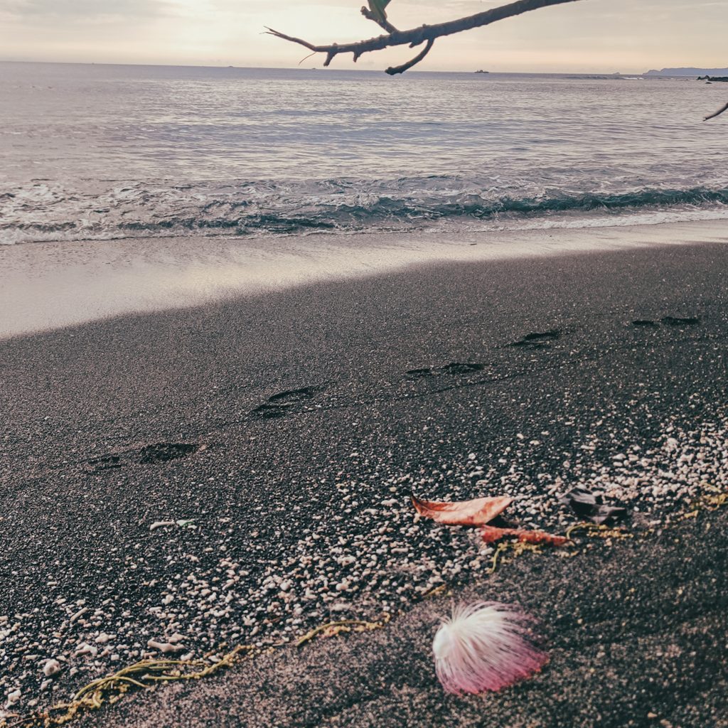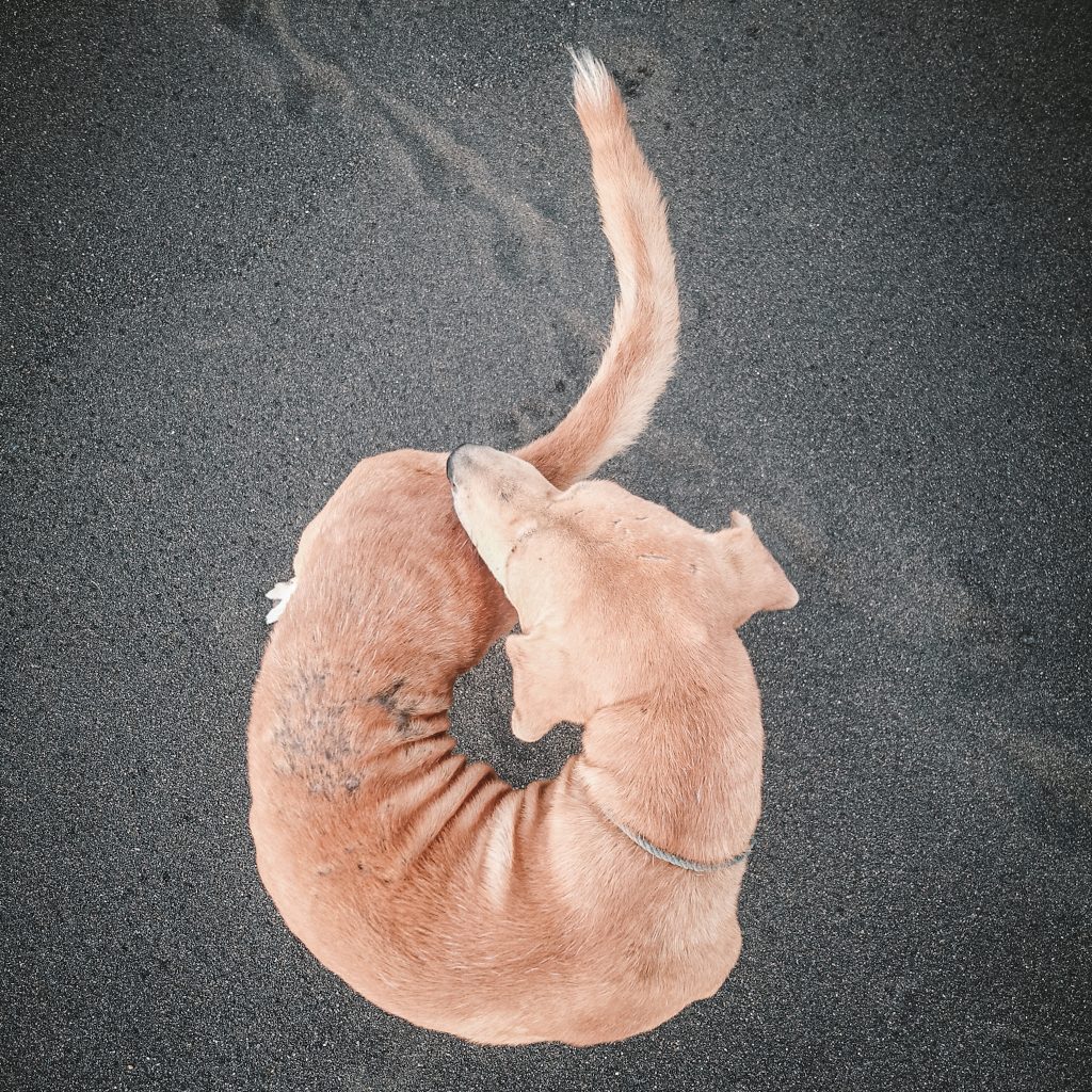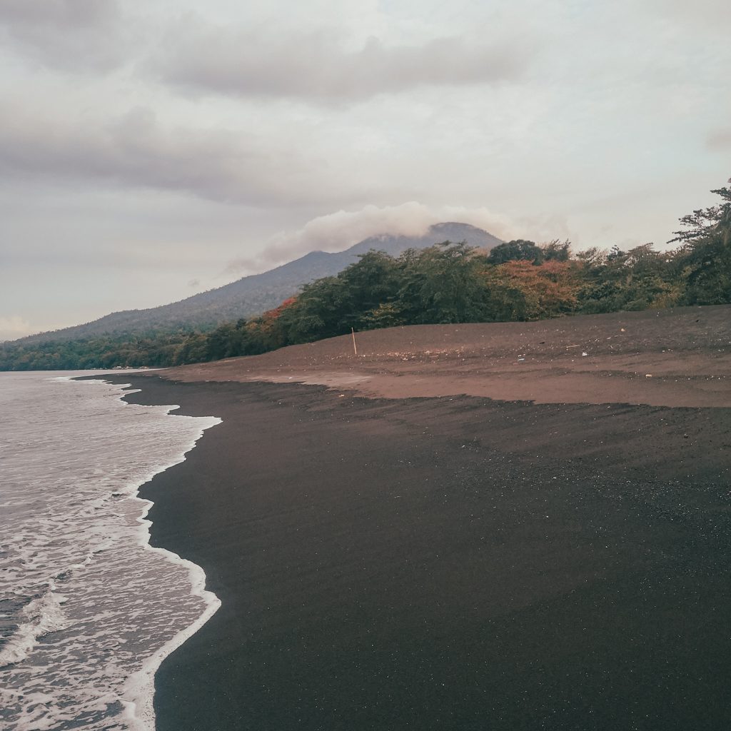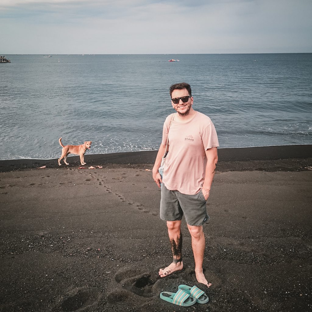 Wir werden unser Gepäck los und machen uns direkt auf dem Weg zum Strand. Wir können es nicht erwarten, endlich im Meer schwimmen zu gehen. Davon haben wir ehrlicher Weise schon in Indien geträumt. Wir müssen nur einmal um unser Guesthouse herumgehen, einem kleinen Weg folgen und keine 5 Minuten später sind wir da: am schwarzen Strand. Der Sand ist tatsächlich schwarz und auch das Meer wirkt auf den ersten Blick etwas düsterer als an einem weißen Sandstrand. Statt von Kieler Möwen werden wir von zwei Hähnen begrüßt. Warum auch nicht und als dann noch ein süßer Hund hinzukommt, sind wir noch ein kleines bisschen glücklicher. Jetzt aber ab ins Wasser. Konsti ist hocherfreut, endlich wieder im Salzwasser zu planschen und Caro braucht aufgrund der warmen Wassertemperaturen ausnahmsweise keine Ewigkeit bis sie im Wasser ist. Außer uns sind nur noch ein paar Kinder am Strand. Aus dem Wasser schauen wir wieder auf den grünen und dicht bewachsenen Nationalpark, ein wirklich schönes Bild.