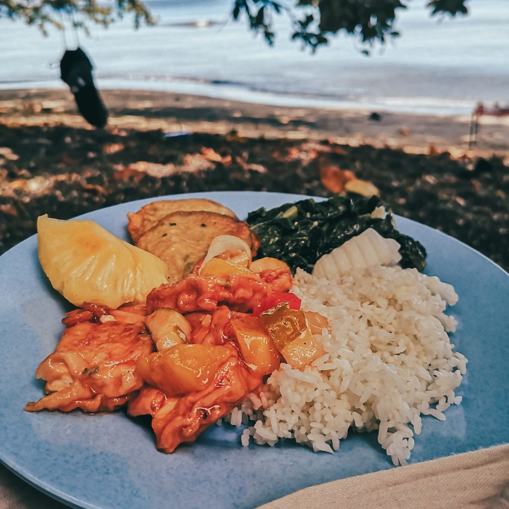 Da wir eine Tagestour gebucht haben, machen wir eine ausgiebige Mittagspause am Strand. Wir hüpfen als erstes ins Wasser, an Badesachen haben wir gedacht. An Schnorchel leider nicht, wobei dieser gut hätte zum Einsatz kommen können. Während wir die Aussicht an weißen Strand genießen, kommt irgendwann Basca mit unserem Mittagessen. Direkt am Strand baut sie einen Tisch auf und wir werden mit einem köstlichen und sehr umfangreichen Mittagessen versorgt. Was ein Service. Wir fühlen uns fast ein bisschen wie im Cluburlaub. Die Mittagspause zieht sich etwas in die Länge und Caro döst ein bisschen ein, schließlich waren wir ja auch früh wach ☝️