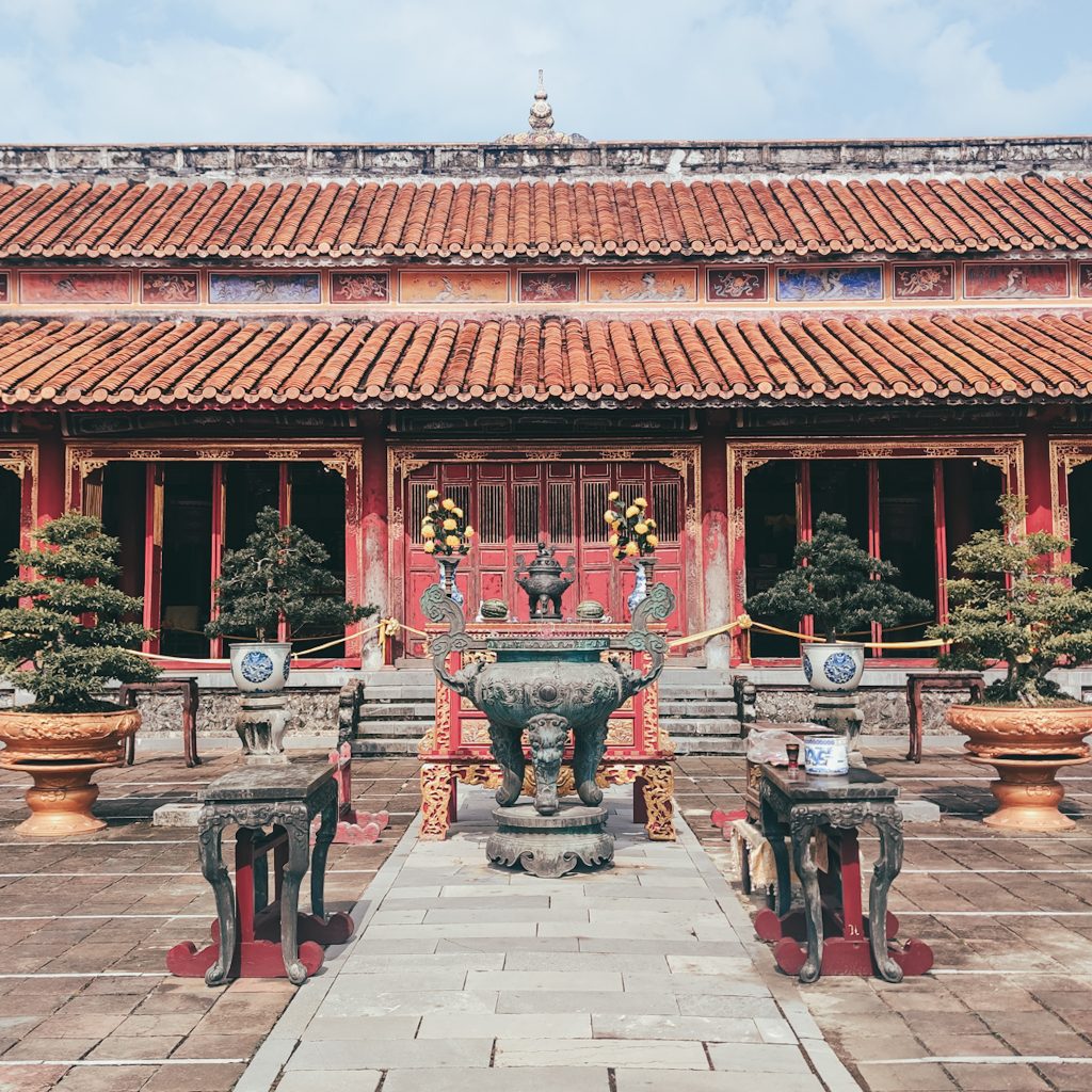 Wir haben schon vorab gelesen, dass es empfehlenswert ist, sich einen Guide zu nehmen. Am Ende sind wir etwas froh, dass wir es nicht gemacht haben. Auch ohne Guide laufen wir zwei Stunden über das große Gelände. Mit Guide hätten wir sicherlich doppelt so viel Zeit gebraucht, mindestens. Irgendwo lesen wir etwas von einem sechsstündigen Aufenthalt. Sicher interessant, aber dafür sind wir heute zu müde und gefrühstückt haben wir auch noch nichts. „Kulturbanausig“ überholen wir die Gruppenführungen und lesen uns gegenseitig Internetartikel zur Zitadelle vor. Wahnsinn, was für eine Bedeutung die Dynastie zu ihrer Zeit hatte. In einem großen Palast stehen überdimensionale Portraits der verschiedenen Kaiser mit großen Altären und zahlreichen Opfergaben.