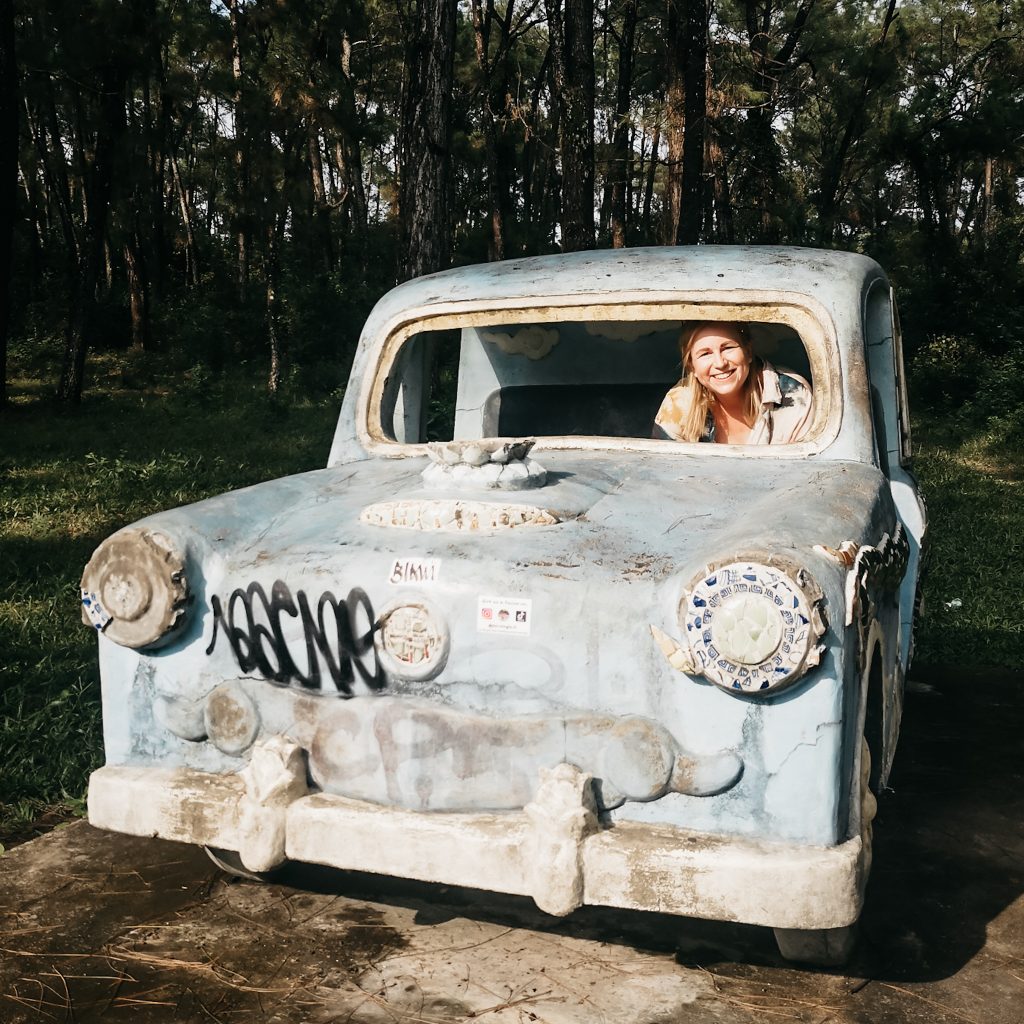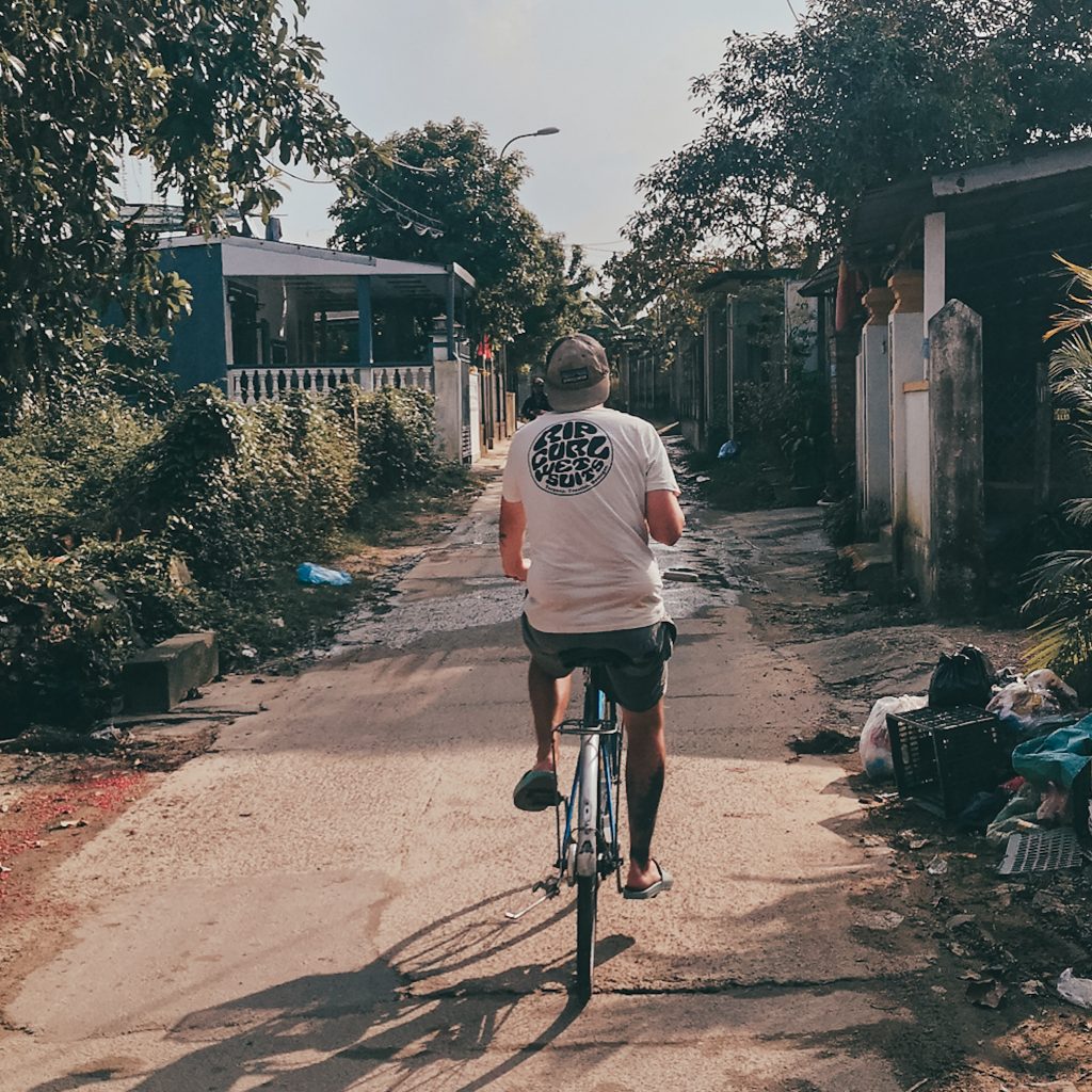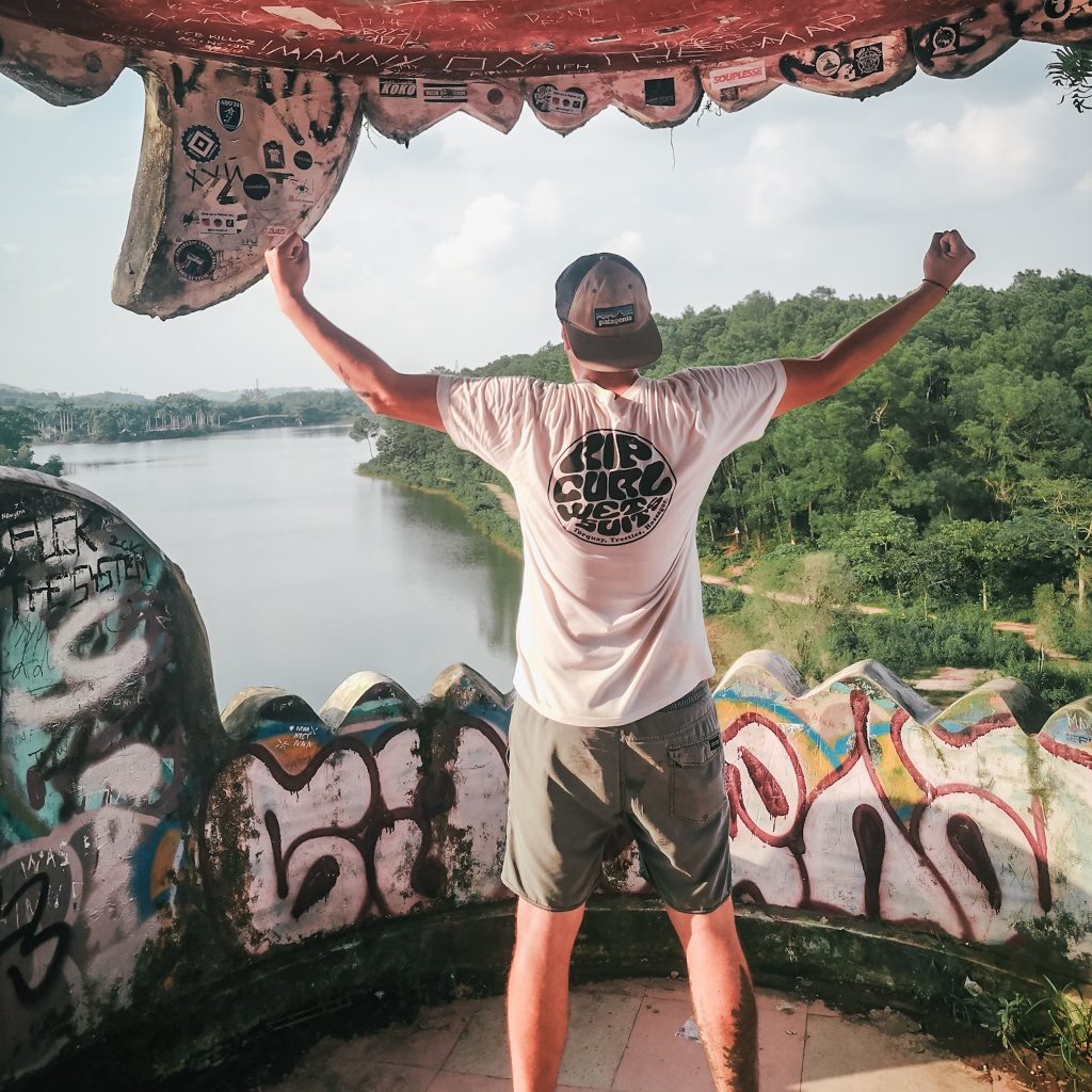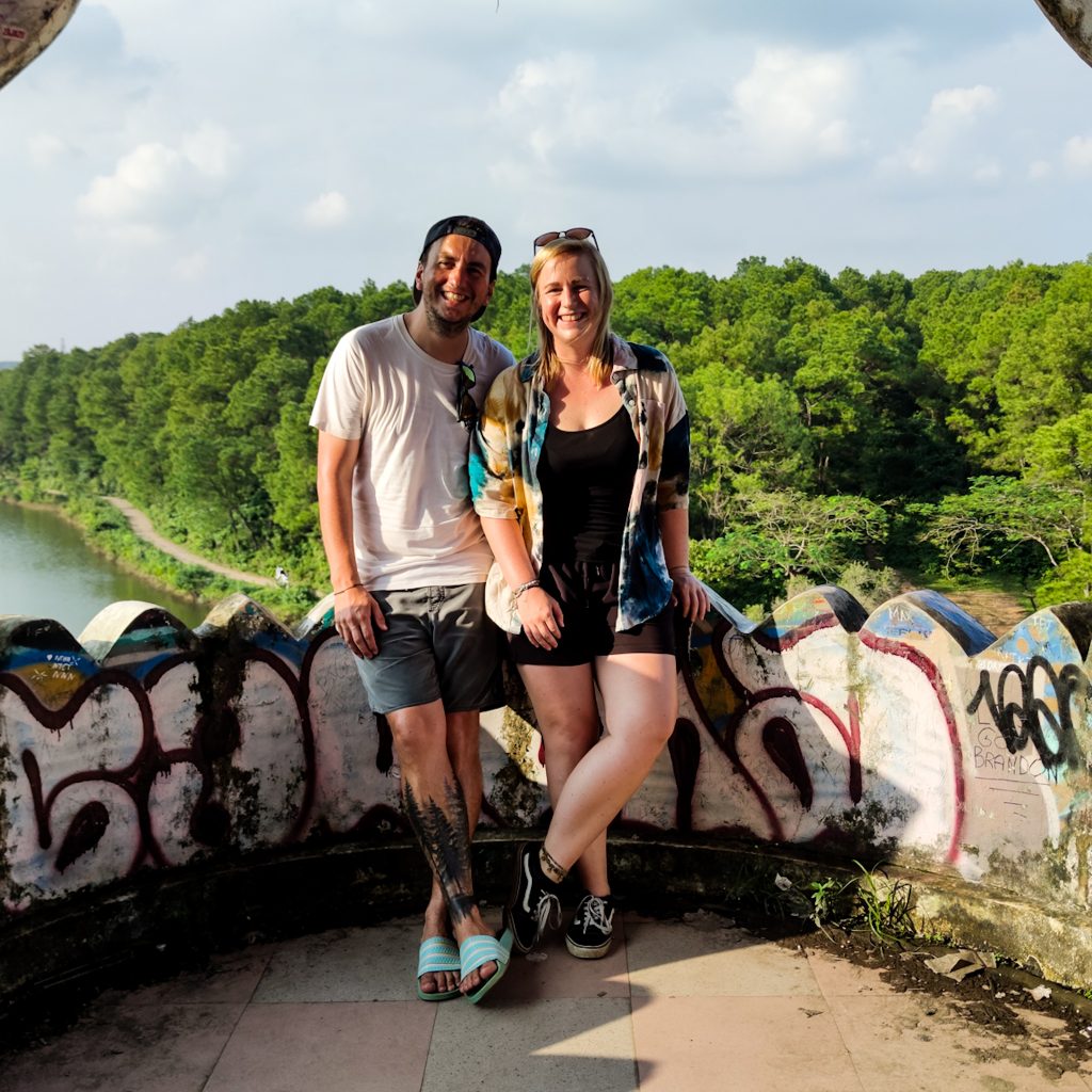 Man könnte behaupten, dass wir (hipp und modern wie wir sind – in dem Zusammenhang eine super Wortwahl) jetzt unter die „Lost-Place-Explorer“ gehen. Da uns aber nichts ferner liegt, als unsere liebsten Menschen an der Nase herumzuführen, geben wir offen zu: Der verlassende Wasserpark ist bei weitem kein Geheimtipp in Hué und wahrscheinlich gehört er heute genauso dazu, wie der Besuch der Zitadelle. Der Gastgeber unserer Unterkunft schaut uns etwas schräg an, als wir sagen, dass wir mit den Fahrrädern dorthin fahren wollen. Tatsächlich ist es etwas wild, hier im Straßenverkehr mit dem Fahrrad unterwegs zu sein. Fahrradwege gibt es natürlich nicht und dass der Verkehr in Vietnam generell etwas „hektischer“ ist, habt ihr ja bereits mitbekommen. Nicht selten wird man also eng von einem Auto mit Vollgas überholt oder von einem Roller aus dem Weg gehupt. Straßenkreuzungen gleichen einem kleinen Glücksspiel. Am besten einfach fahren, die Hände stets an der Bremse und die Augen in 360 Grad Wachstellung. Kein Problem. Schade, nur dass unsere Fahrräder keine Klingel haben, wir scheinen wirklich das letzte Glied der Verkehrskette zu sein. Mal wieder müssen wir an die Fahrradreisenden denken, die wir unterwegs getroffen haben. Unglaublich, dass genau das deren täglich Brot ist. Nachdem wir aus der Stadt raus sind, wird es etwas ruhiger. Wir fahren auf kleinen Straßen durch noch kleinere Dörfchen, hier ist es richtig schön. Am Wasserpark angekommen parken wir unsere Fahrräder und machen uns zu Fuß auf Erkundungstour.