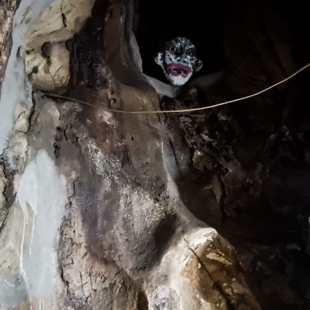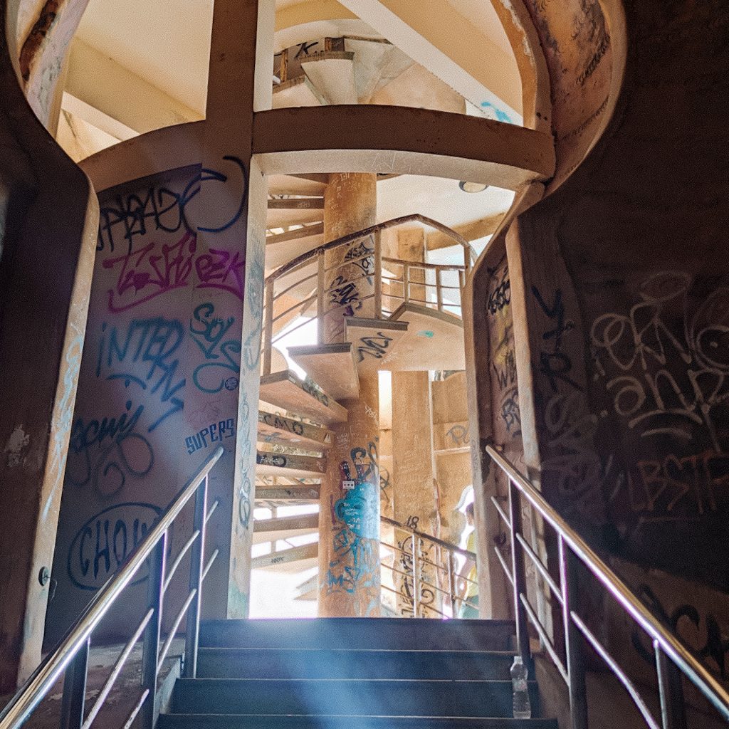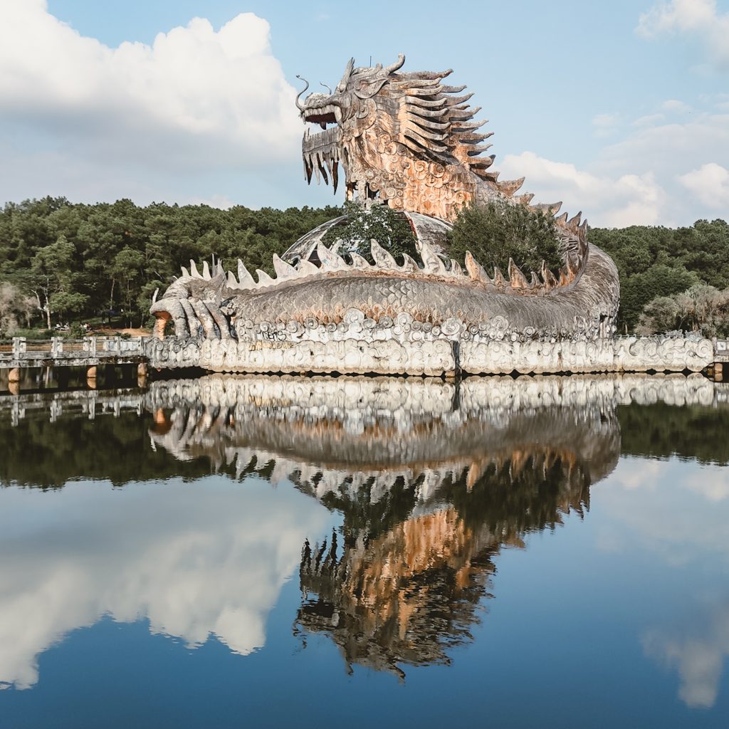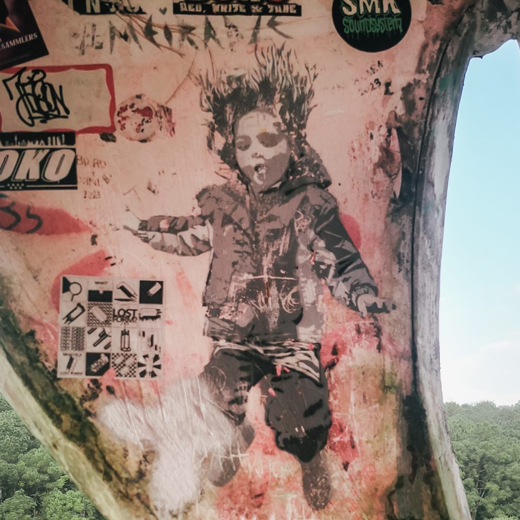 Das Herzstück, oder besser gesagt, der Foto Hotspot aller Influencer und derer, die es werden wollen, ist ein großer Drache, der am Rande eines Sees ist. Über eine Brücke und ein kleines Treppen-Labyrinth (jedenfalls für uns, denn erst nach ein paar Anläufen finden wir den richtigen Aufstieg) kommt man hinauf bis in den Kopf des Drachens. Die Atmosphäre ist genau wie es bei einem verlassenden Ort sein sollte: Alles ist zugemüllt, voll gesprayt, dort wo irgendwann mal Fenster gewesen sein müssen, ist jetzt ein Meer aus Scherben. Uns gefällt es auf jeden Fall. Wir sind zwar nicht ganz alleine hier, aber es ist auch alles andere als überlaufen.