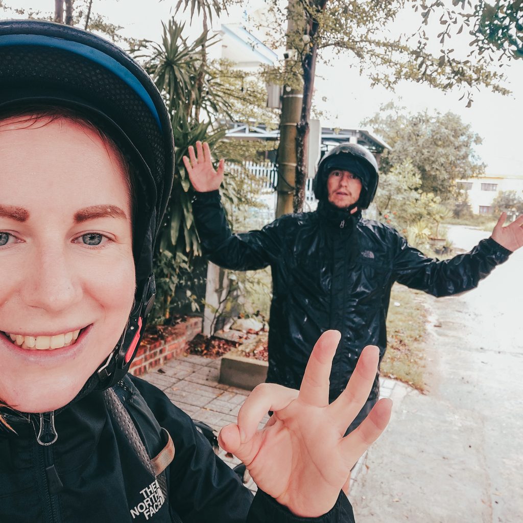 Am nächsten Morgen wird unser Roller zu unserer Unterkunft gebracht und unser Gepäck wird eingesammelt. Sozusagen ein All-Inclusive-Paket. Für die Fahrt haben wir nur das nötigste dabei. Und was heute am nötigsten ist: die Regenjacke. Trockenen Fußes kommen wir so gerade noch zur 200 m entfernten Tankstelle. Dann ist der Regen erstmal unser ständiger Begleiter. Knapp über zwei Stunden fahren wir bis kurz vor den Pass. Wir sind KOMPLETT nass. Konstis Regenjacke hat leider nachgegeben, er ist bis auf die Unterhose nass. Caro hat komplett nasse Füße und Beine, glücklicherweise hat Konsti aber den meisten Regen abgefangen.