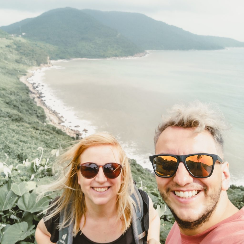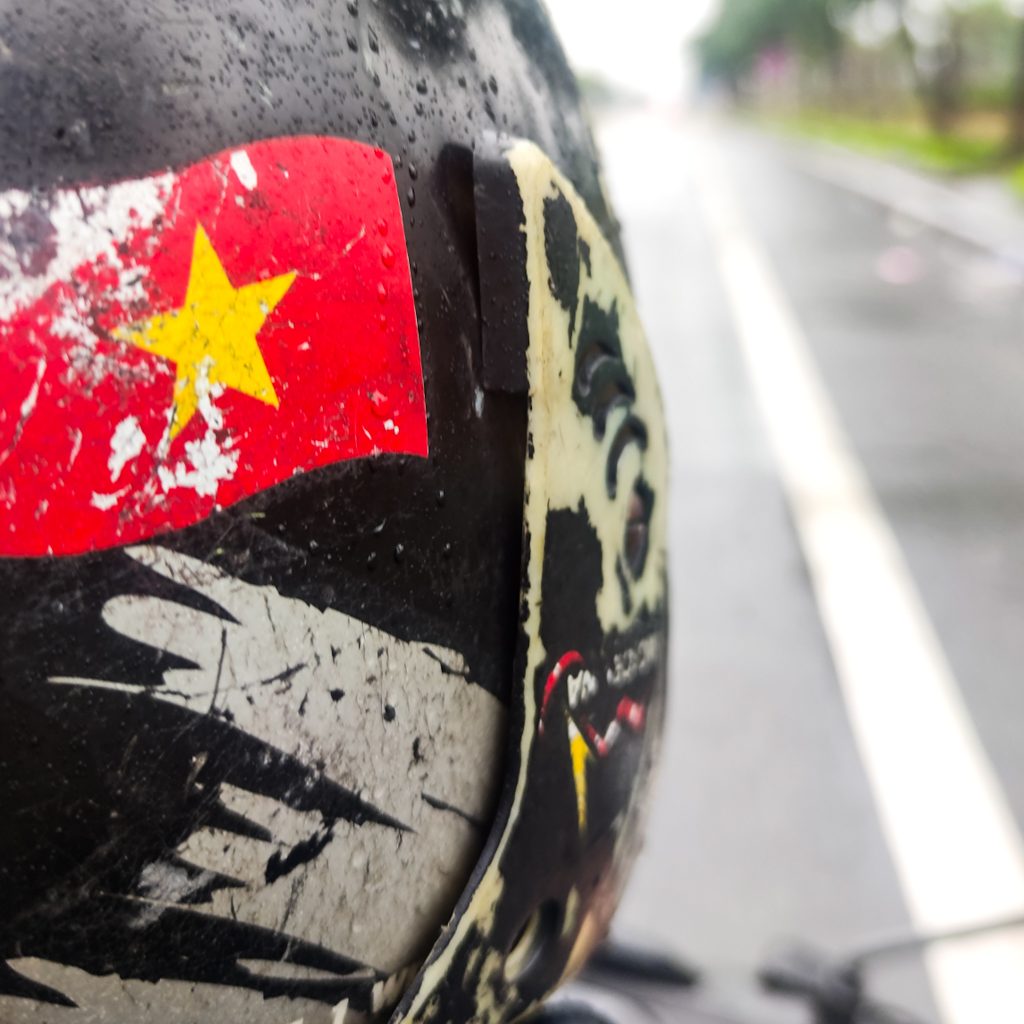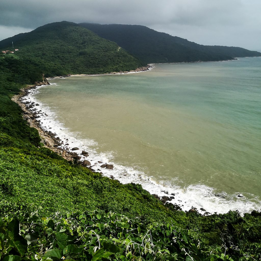 Wir machen Pause in einem Café. Der Besitzer ist super freundlich und versorgt uns mit ein paar Gläsern heißem Tee zum Aufwärmen. Dazu bestellen wir noch zwei Kaffee und machen eine kleine Pause. Genau zum richtigen Zeitpunkt, denn als wir unsere Fahrt fortsetzen, hat es tatsächlich aufgehört, zu regnen. Genau passend zu Beginn des Hai Van Passes. Wir sind jetzt direkt an der Küste. Links von uns das Meer und wir folgen der kurvigen Straße bergauf. Rechts von uns ist alles grün. Wunderschön, da kann man auch mal ein bisschen Regen in Kauf nehmen. Wir halten ein paar Mal und genießen die tolle Aussicht. Ein Wasserfall gibt es auch noch auf der Strecke, wäre ja auch komisch, wenn nicht. Auf dem Pass selbst, sind wir dann schneller als gedacht. Hier sind ein paar Cafés und natürlich ein paar Touri-Busse. Wir fahren weiter und finden nochmal einen viel schöneren Spot mit Aussicht auf eine Bucht. Hier sind wir (zumindest eine ganze Zeit) alleine.