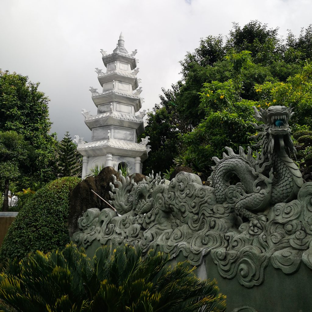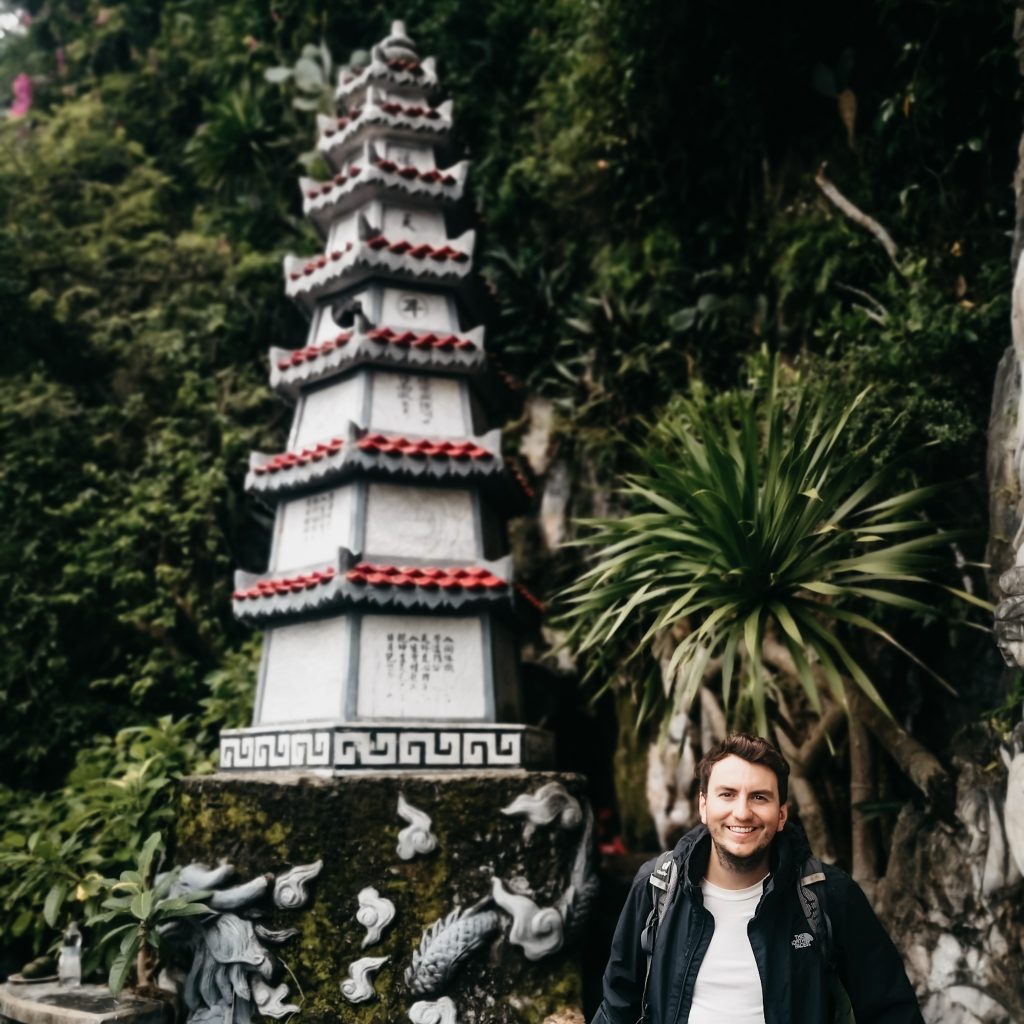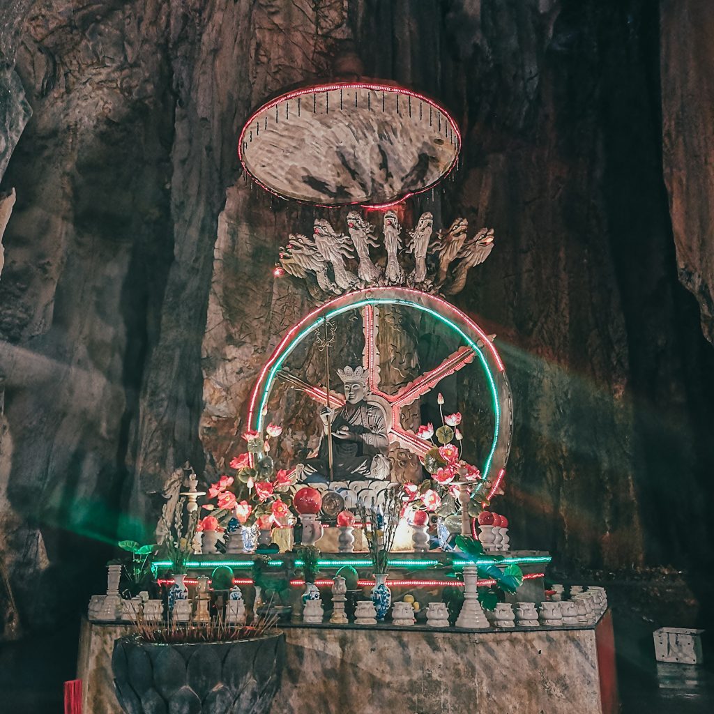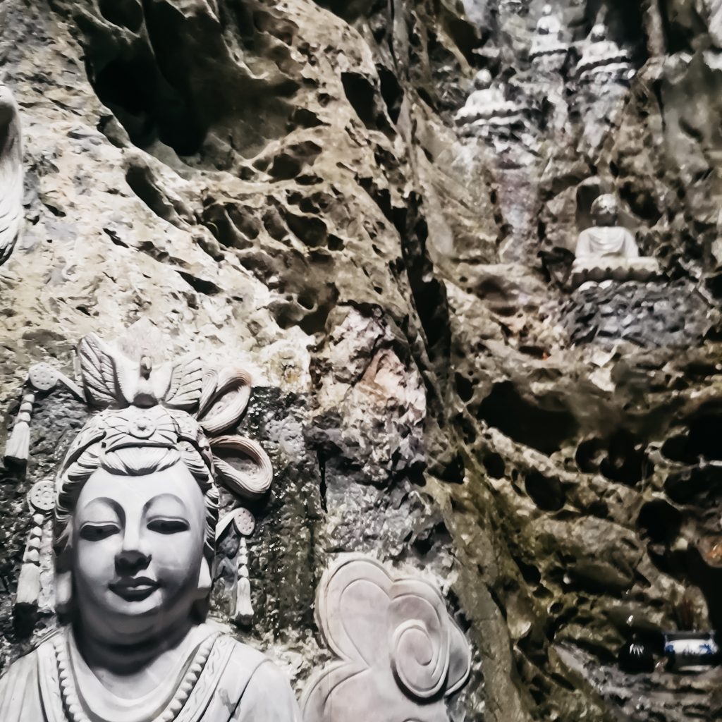 Einen Zwischenstopp bauen wir auf unserer heutigen Tour noch ein. Die Mable Mountains oder auch „Fünf-Elemente-Berge“ sind eine Ansammlung von fünf Marmor- und Kalksteinhügeln. Sie sind nach den fünf Elementen der traditionell östlichen Philosophie benannt: Kim (Metall), Thủy (Wasser), Mộc (Holz), Hỏa (Feuer) und Thổ (Erde). Alle Berge haben Höhleneingänge und zahlreiche Tunnel. In den Bergen befinden sich auch mehrere buddhistische Heiligtümer, die dieses Gebiet zu einem touristischen Ziel machen. Darüber hinaus ist die Gegend ist bekannt für die Herstellung von Steinskulpturen und das Steinmetzhandwerk. Die direkte Gesteinsgewinnung in den Bergen wurde vor kurzem verboten. Überall stehen riesige Steinfiguren in allen Größen. Da es mal wieder anfängt zu regnen, halten wir es für einen cleveren Schachzug, uns heute die dazugehörige Höhle anzuschauen. Wir stellen aber schnell fest, dass es auch hier ordentlich von der Decke tropft. Die Höhle ist groß und sehr gut ausgebaut und beleuchtet. Immer wieder sehen wir skurrile Steinfiguren, die aussehen, als wenn sie direkt aus der Hölle ihren Weg hierher gefunden haben. Dann wiederum sehen wir viele in der Höhlenwand platzierte Buddha-Figuren. Über steile Treppenstufen gehen wir hinaus zu einem Aussichtspunkt und einer weiteren kleinen Pagode.