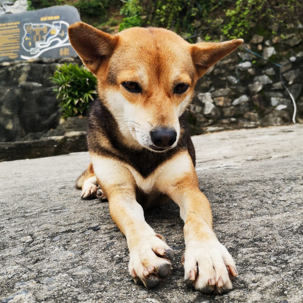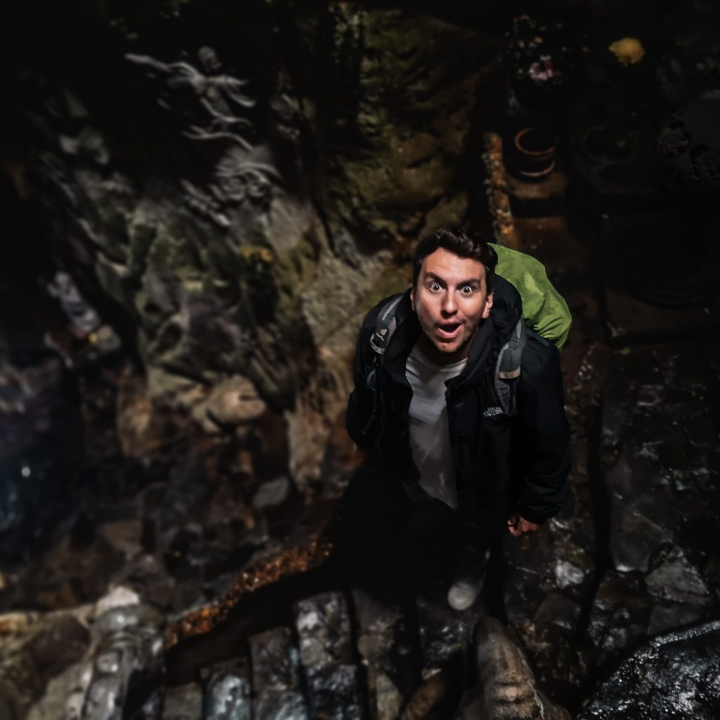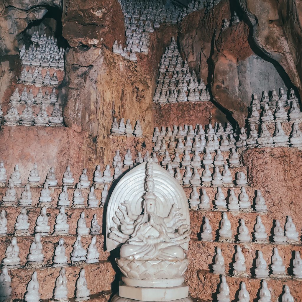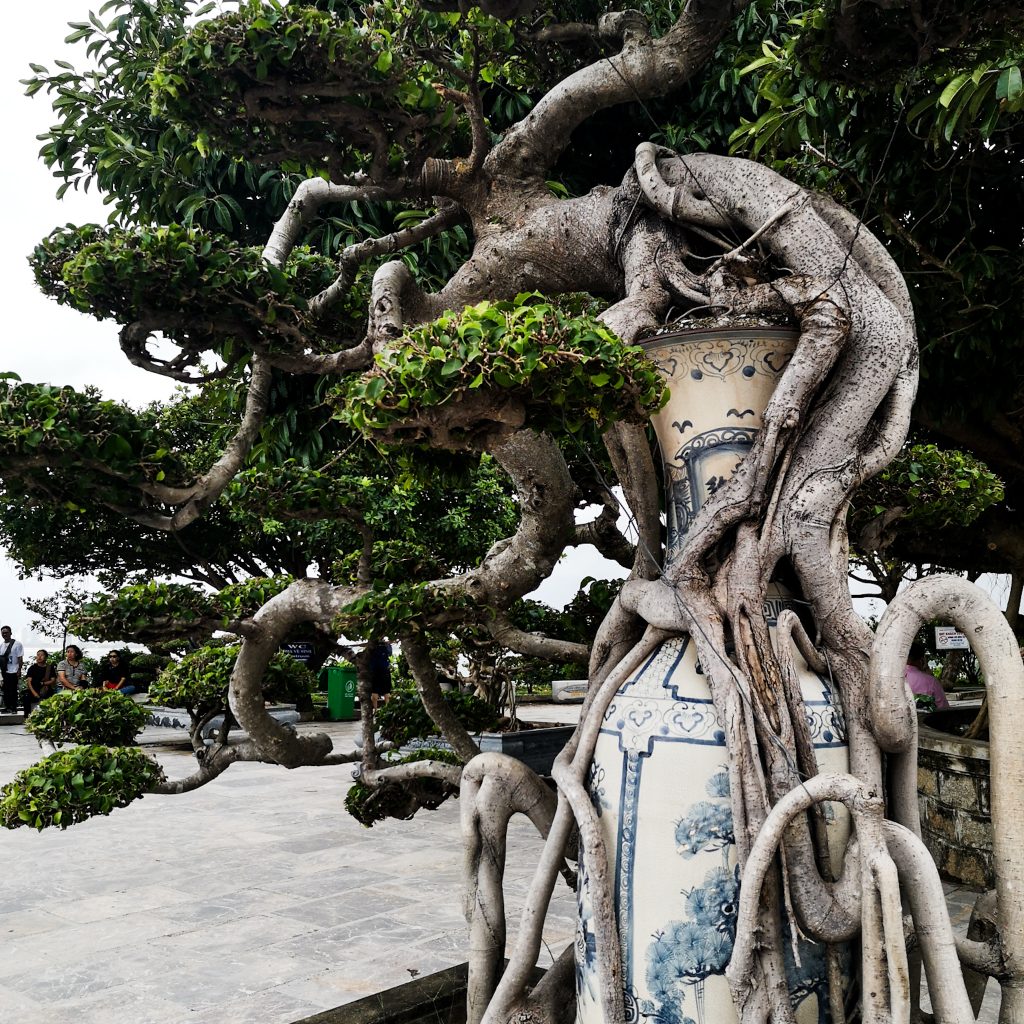 Einen Zwischenstopp bauen wir auf unserer heutigen Tour noch ein. Die Mable Mountains oder auch „Fünf-Elemente-Berge“ sind eine Ansammlung von fünf Marmor- und Kalksteinhügeln. Sie sind nach den fünf Elementen der traditionell östlichen Philosophie benannt: Kim (Metall), Thủy (Wasser), Mộc (Holz), Hỏa (Feuer) und Thổ (Erde). Alle Berge haben Höhleneingänge und zahlreiche Tunnel. In den Bergen befinden sich auch mehrere buddhistische Heiligtümer, die dieses Gebiet zu einem touristischen Ziel machen. Darüber hinaus ist die Gegend ist bekannt für die Herstellung von Steinskulpturen und das Steinmetzhandwerk. Die direkte Gesteinsgewinnung in den Bergen wurde vor kurzem verboten. Überall stehen riesige Steinfiguren in allen Größen. Da es mal wieder anfängt zu regnen, halten wir es für einen cleveren Schachzug, uns heute die dazugehörige Höhle anzuschauen. Wir stellen aber schnell fest, dass es auch hier ordentlich von der Decke tropft. Die Höhle ist groß und sehr gut ausgebaut und beleuchtet. Immer wieder sehen wir skurrile Steinfiguren, die aussehen, als wenn sie direkt aus der Hölle ihren Weg hierher gefunden haben. Dann wiederum sehen wir viele in der Höhlenwand platzierte Buddha-Figuren. Über steile Treppenstufen gehen wir hinaus zu einem Aussichtspunkt und einer weiteren kleinen Pagode.
