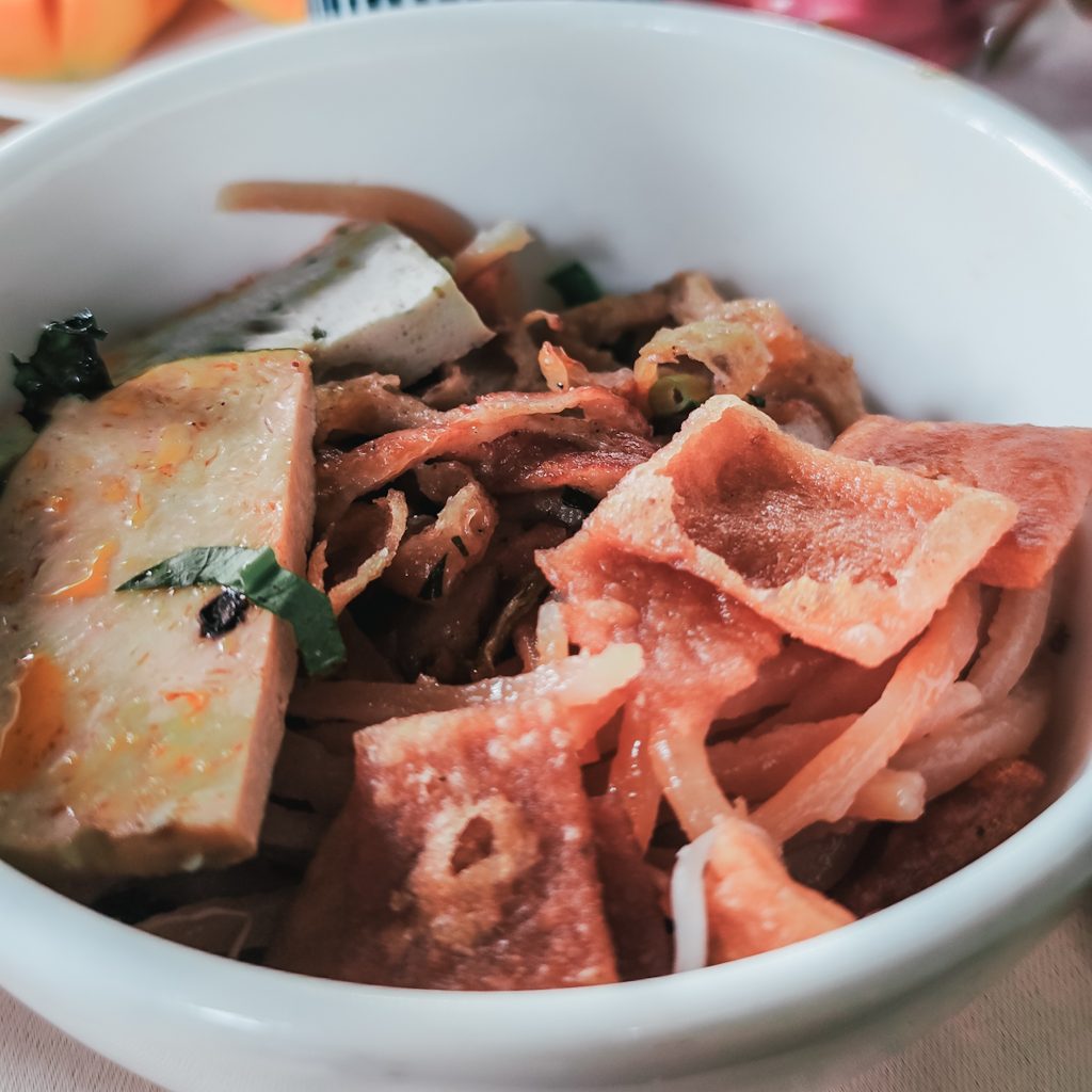 Serviert werden die Nudeln dann nach dem Kochen in einer Schale mit weiteren Einlagen wie Sojasprossen, in unserem Fall vegetarische Soja-Protein-Schnipsel, Pakchoi. Die heiße Sauce wird separat gereicht und wird dann über die Nudeln gegossen. Einige der rohen Nudeln werden auch in Quadrate geschnitten und knusprig frittiert; diese sind eine zusätzliche Garnitur verwendet. Dann fehlt nur noch die frische Komponente in Form von frischem Salat und Kräutern. Wie auch bei der Pho wird immer ein separater Teller mit „Grünzeug“ dazu gestellt. Die Auswahl ist immer unterschiedlich, manchmal ist Koriander dabei, manchmal Minze oder Thaibasilikum und manchmal (na gut, meistens) haben wir auch keinen blassen Schimmer.