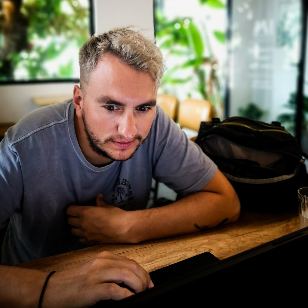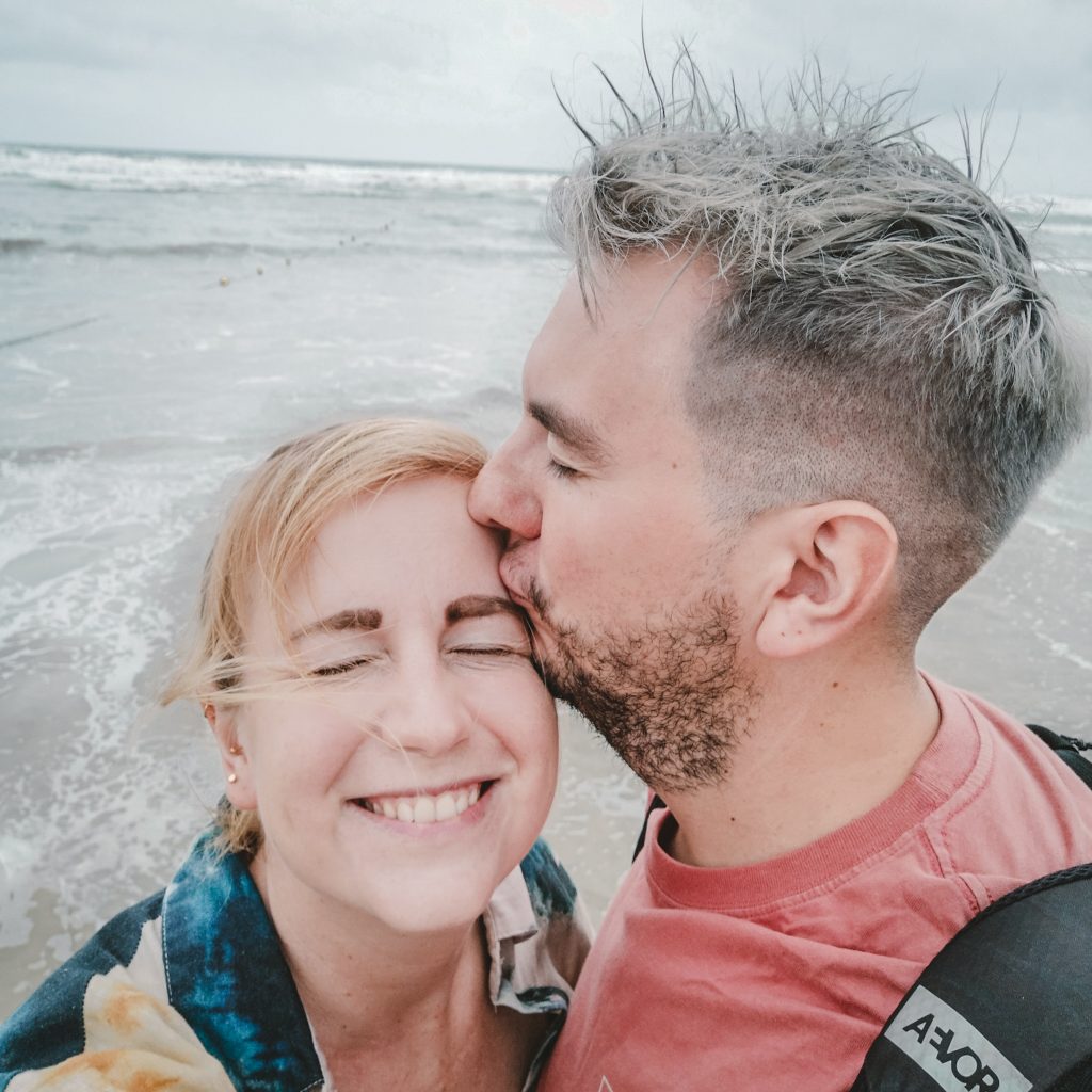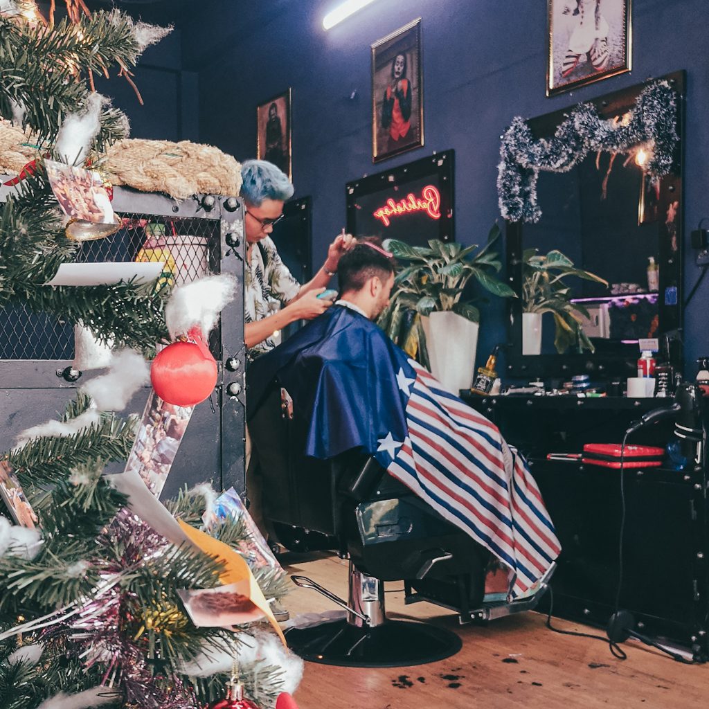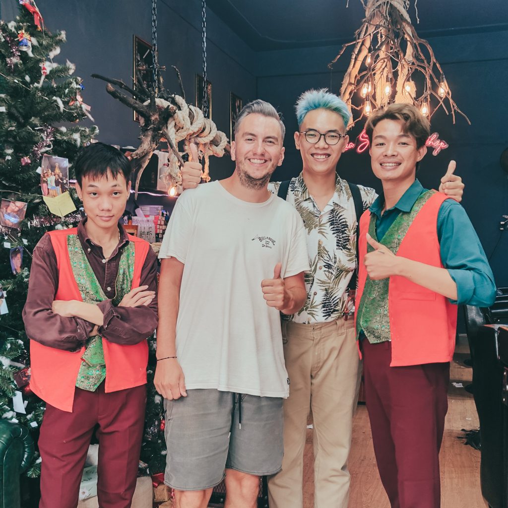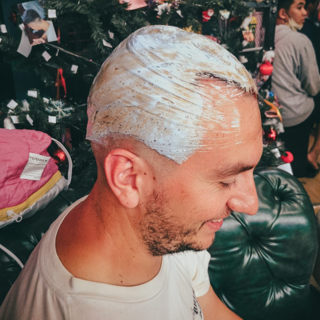Wir suchen Schutz beim Friseur, das passt doch ganz bei dem Wetter ganz hervorragend zu unserem Tagesprogramm. Heute wagen wir mal etwas ganz neues: Haare färben. Wenn nicht jetzt, wann dann? Aber die folgenden 2,5 Stunden wird nicht etwa Konsti auf der Besucher:innen-Couch warten, sondern Caro. Schon seit längerem möchte Konsti sich die Haare blond färben. Im Handy hat er die perfekte Vorlage immer parat. Bisher haben wir nur noch nicht den richtigen Friseur gefunden. Doch hier sind wir goldrichtig: Wir werden von einem jungen Mann mit Hosenträgern und blauen Haaren in Empfang genommen. Haare färben? Klar, das machen wir. Das Englisch ist weder bei ihm noch bei seinen Kollegen so gut, dass man sich problemlos verständigen kann. Dafür haben wir ja das Foto und Konsti erklärt ganz genau, wie er es gerne hätte. Dann wird unter Caros schockierten Augen erstmal der Nacken ausrasiert. Das ist kurz, wirklich sehr kurz. Aber aktuell sind zumindest noch oben alle Haare lang und dann geht’s auch schon los.