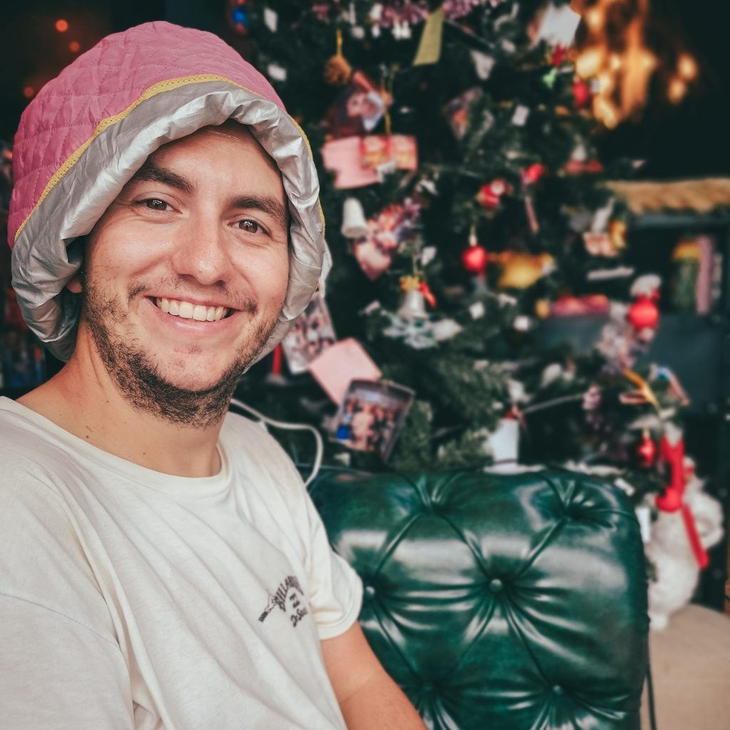 Bei lauter Weihnachtsmusik (auch der Laden ist höchst weihnachtlich geschmückt und es gibt sogar einen Weihnachtsbaum) wird die erste Farbschicht aufgetragen. Kurz danach ist erstmal warten angesagt. Schön mit pinker Wärmehaube. Das gleiche Prozedere folgt noch einmal. Dann sind die Haare ziemlich hell und blond. Eigentlich genau so, wie Konsti es es sich vorgestellt hat.