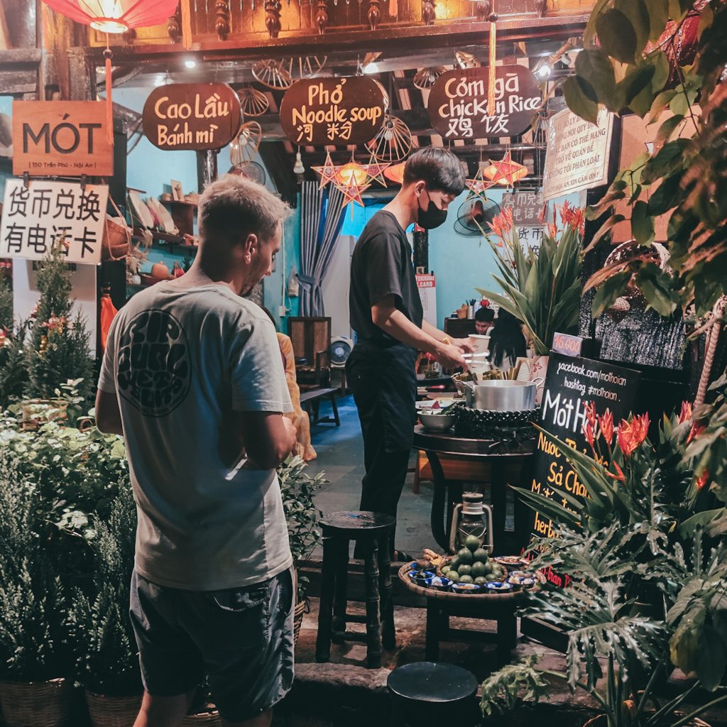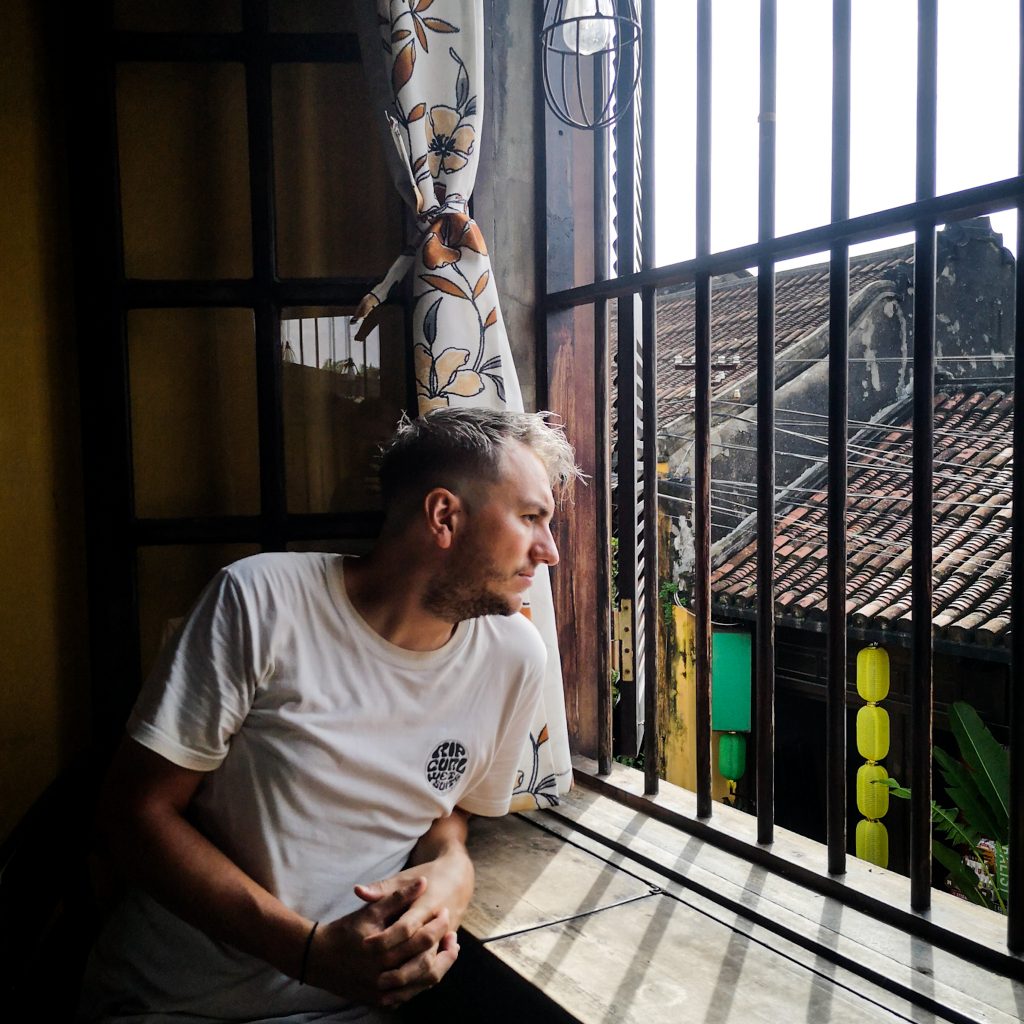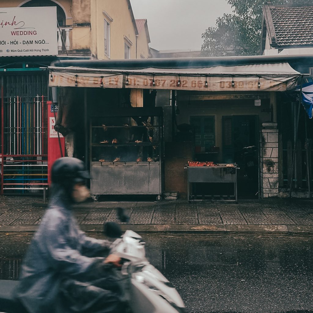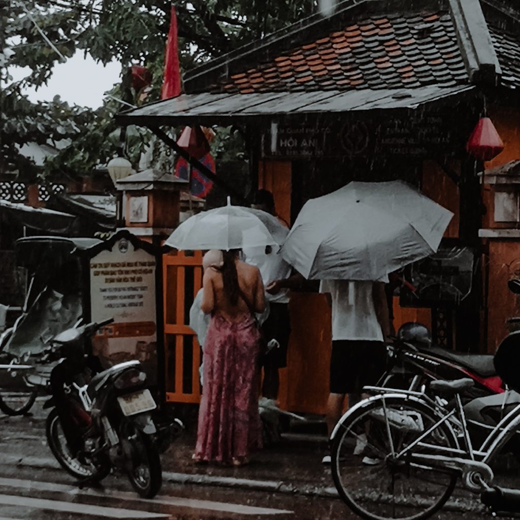 Dann fängt es an, zu schütten. Wir rutschen mit den Stühlen ganz nah an den überdachten Stand heran und schauen dabei zu, wie die Regenschirm- und Poncho-Verkäuferin mal wieder erfolgreich ein Geschäft mit Reisenden abschließt, die in T-Shirt und Kleid vom Regen überrascht wurden. Da es jetzt erstmal nicht so scheint, als würde es in nächster Zeit trocken bleiben, machen wir uns auf den Weg ins nächste Café. Dieses Mal ohne Aussicht, dafür im überdachten Innenhof. Hier schmeckt sogar der Flat White. Wir nutzen die immer wiederkehrenden Regenschauer, die es ganz schön in sich haben, um Blogartikel zu schreiben. Zwischendurch verzieht sich Konsti und beantwortet drölftausend Sprachnachrichten. Irgendwie wollen wir aber nicht den Rest des Tages mit Kaffee trinken und Essen verbringen, wir sind ja nur einmal in Hoi An.