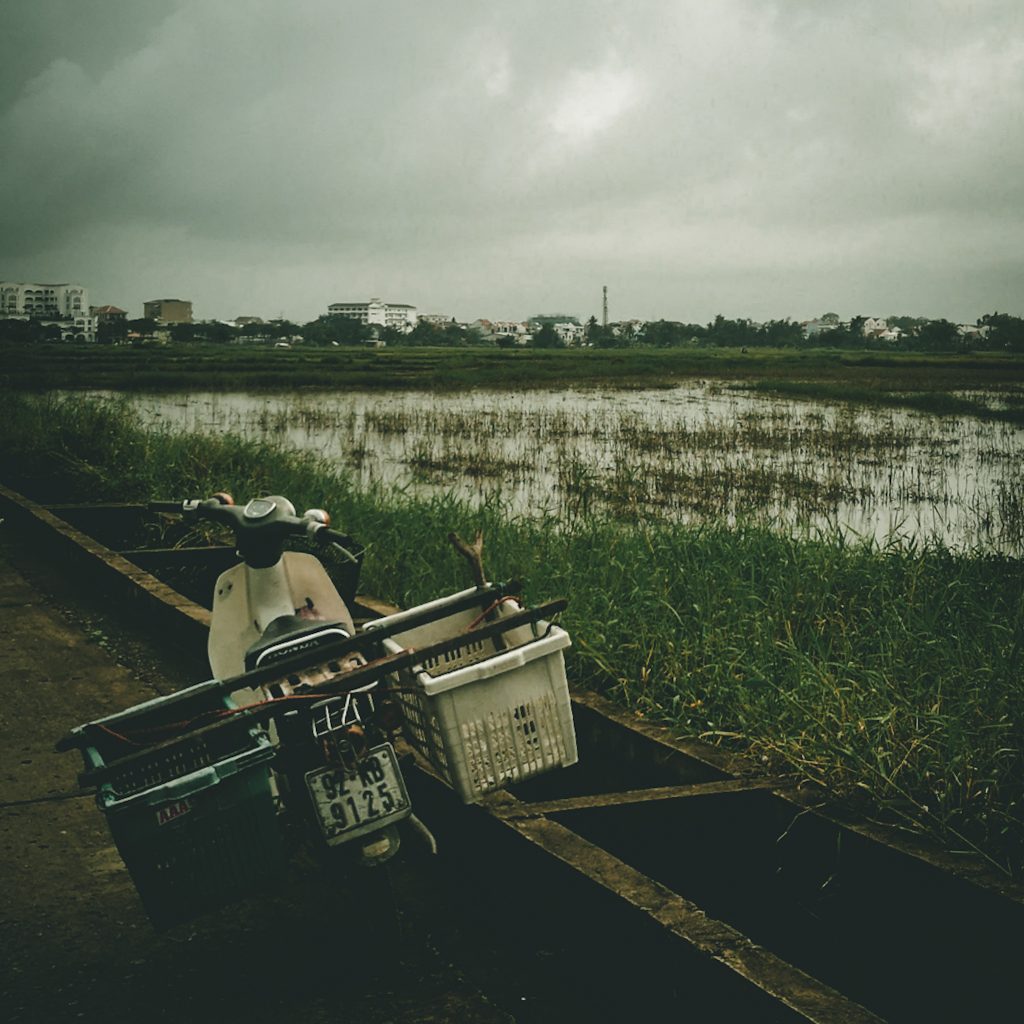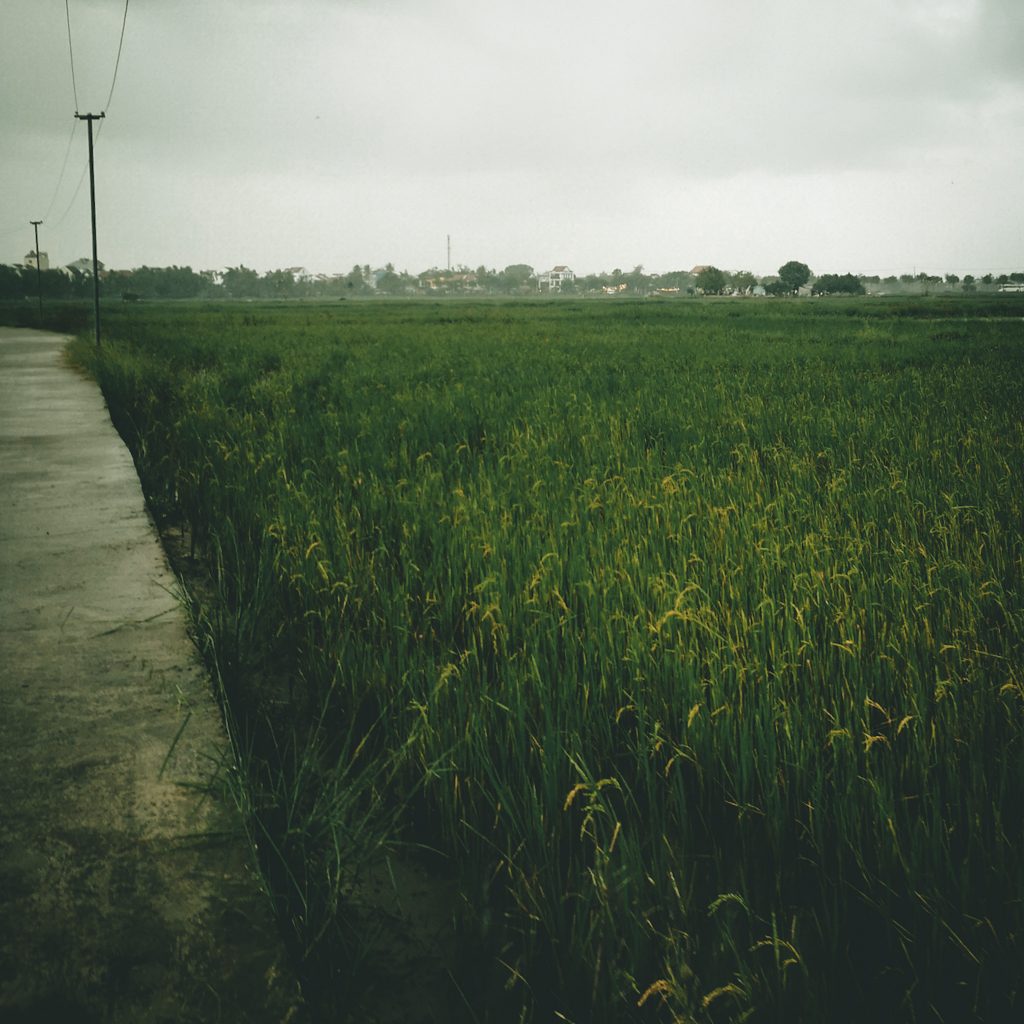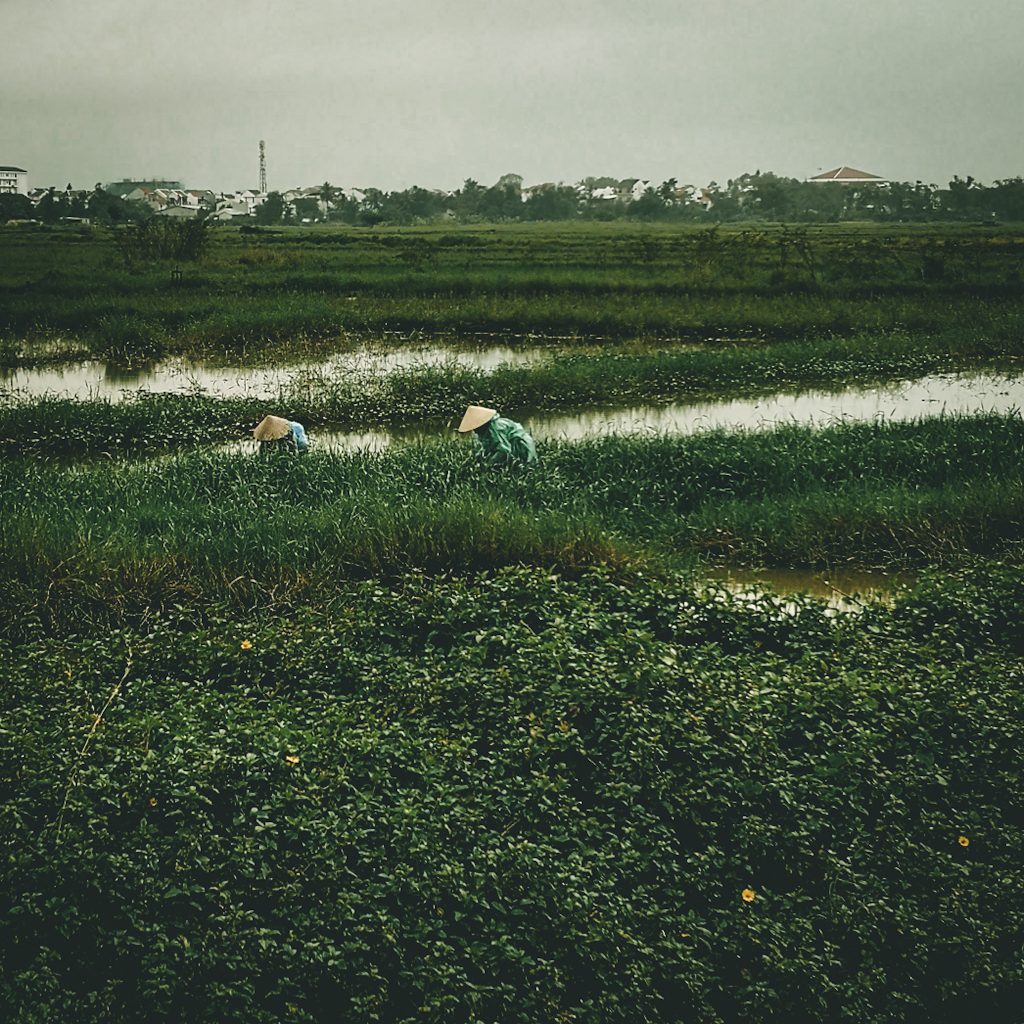 Konsti hat einen alternativen Weg durch die Reisfelder bei Google Maps herausgesucht. Wir biegen von der Hauptstraße auf einen kleinen geteerten Weg ab. Schlagartig wird es grün um uns herum. Überall sind Reisfelder UND jede Menge Roller. Statt einen schönen Spazierweg haben wir wohl den „Shortcut“ der Rollerfahrer:innen erwischt. Trotzdem ist es hier sehr schön und immer wieder sehen wir Menschen bei Regen auf den Feldern. Sie sind anscheinend aber nicht dabei sich um die Reispflanzen zu kümmern, sondern scheinen eher Reusen oder kleine Netze für Krebse oder ähnliches Fischgetier auszulegen. Außer uns ist hier niemand zu Fuß unterwegs und mittlerweile macht uns der Regen auch nichts mehr aus.
