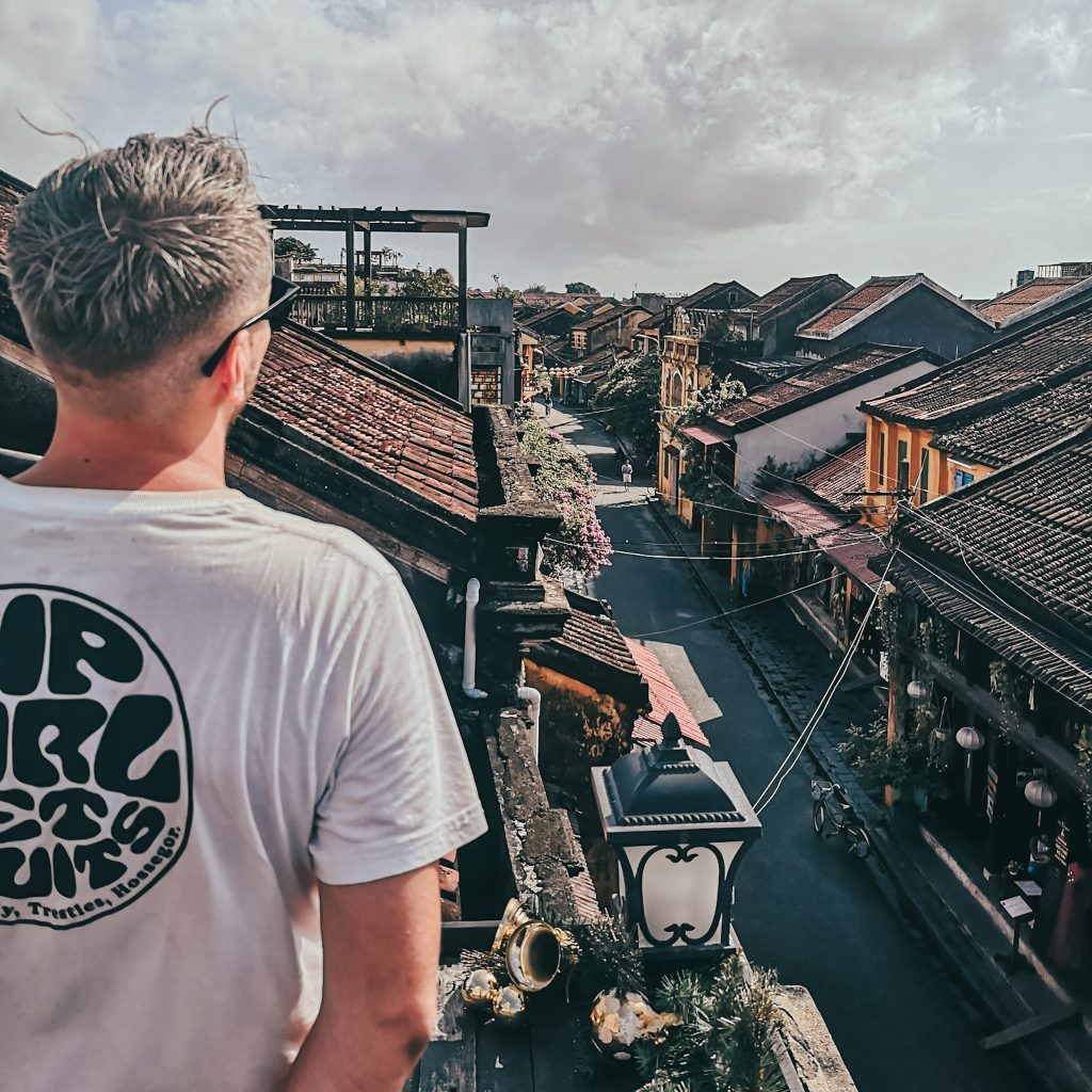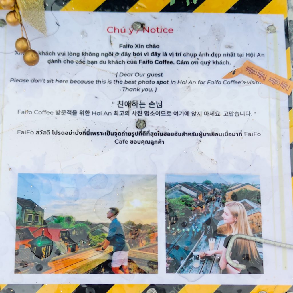 Heute starten wir den Tag ausnahmsweise mal mit einem kleinen Griff ins Klo. Das passiert uns ziemlich selten und ein kleines Gefühl hat uns vorher schon beschlichen. Zum Start in den Tag wollen wir in ein Café mit besonderer Aussicht über die Dächer von Hoi An. Wir haben schon vorher gelesen, dass dies gerne mal als Foto-Hotspot genutzt wird. Oookay, kommt schonmal öfter vor und auch wir machen gerne mal ein Foto mit schöner Aussicht. Wir bestellen uns zwei Flat White und gehen dann auf die Dachterrasse. Es sind sogar Plätze vorne am Geländer frei – cool! Das denken wir genau 10 Sekunden, bis wir einen „Aushang“ sehen: Da es sich um den besten Fotospot handelt, ist es verboten, sich hier hinzusetzen.