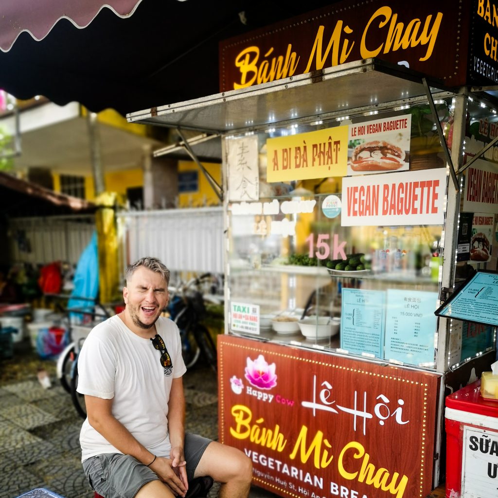 Wir spazieren etwas durch die Straßen und steuern zum Frühstück einen veganen Banh Mi Stand an. Für umgerechnet ca. 60 Cent pro Stück bekommen wir von einer netten älteren Dame ein gut belegtes veganes Banh Mi. Auf kleinen Plastikstühlen sitzen wir vor dem kleinen Stand an der Straße, genießen unser Banh Mi und beobachten das Treiben auf der Straße.