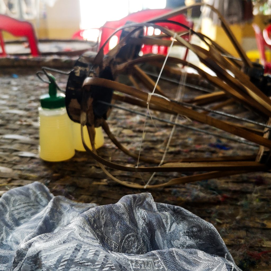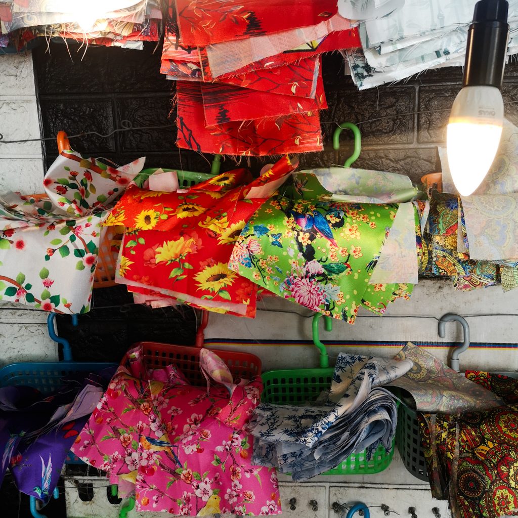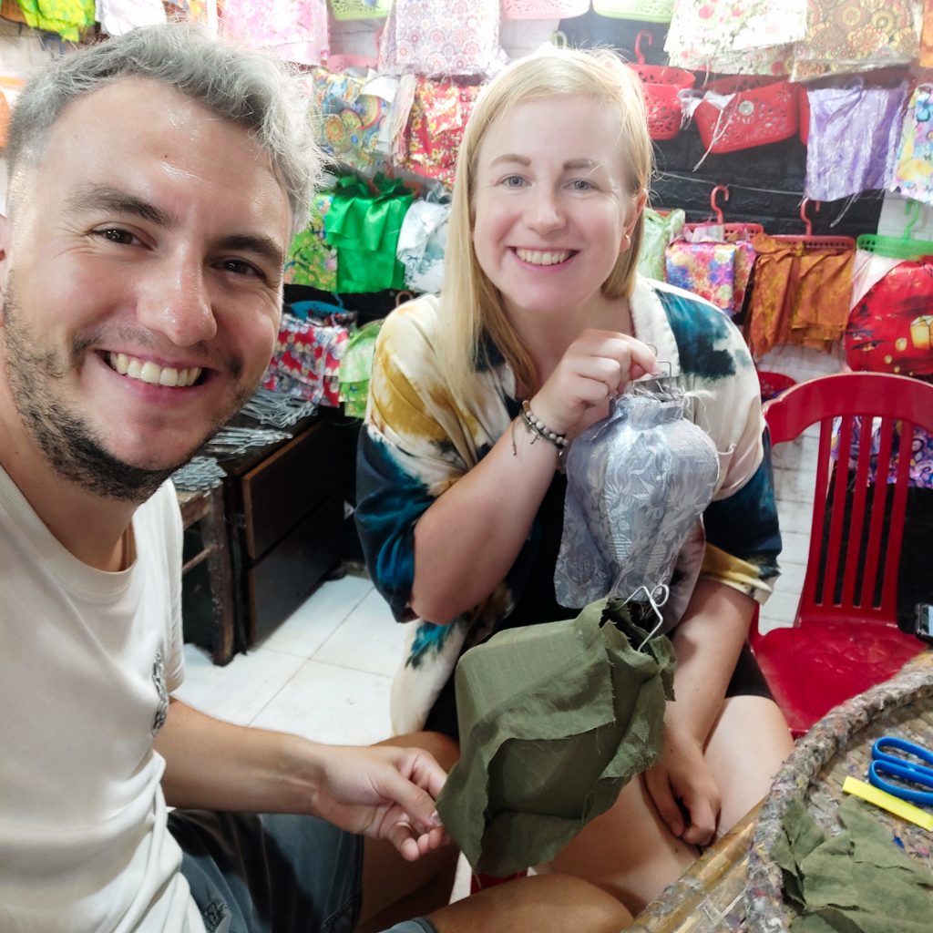 Wir entscheiden uns für das günstigste Angebot mit dem kleinsten, fertigen Gerüst. Konsti wählt das „Diamond“-Modell, Caro entscheidet sich für den „Hoi-An-Style“. Nach der Auswahl des Stoffes geht es auch schon los. Die Bambusstreben müssen mit Kleber vorbereitet werden, anschließend werden die Stofffetzen nach und nach darauf gelegt und gespannt. Zwischendurch kommt die Lantern Lady immer wieder vorbei uns schaut, was wir so fabrizieren. Sie ist begeistert von Konstis Arbeit und lobt ihn jedes Mal, wie toll er das macht. Er scheint ein richtiges Laternen-Bastel-Mäuschen zu sein. Die überschüssigen Stoffreste müssen noch sauber abgeschnitten werden. Zuletzt kleben wir unten und oben noch ein Stoffband für den Rand und suchen uns ein „Zier-Schwänzchen“ aus. Ein besserer Name fällt uns beim besten Willen nicht ein, es gibt bestimmt einen Fachbegriff – wer es besser weiß: Kommentiert gerne unter dem Beitrag und als „Gewinn“ schicken wir euch unsere einzigartigen Laternen. Günstiger werdet ihr niemals wieder an schöneres Handwerk kommen. Auf Wunsch gibt es noch eine persönliche Signierung der Künstler:innen.