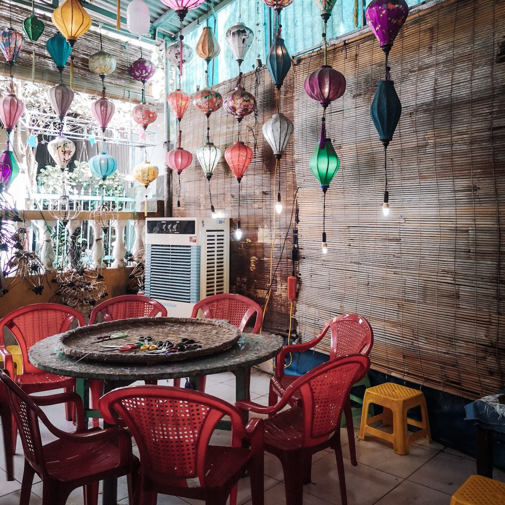 Es braucht nicht viel Überzeugungskraft obwohl unser nächster Programmpunkt eigentlich weniger zu Konstis Lieblingsbeschäftigungen gehört. Wie ihr ja bereits wisst, ist Hoi An bekannt für deine bunten Laternen, die an jedem Haus hängen und am Abend die ganze Stadt stimmungsvoll beleuchten. Passend dazu kann man sich an ein paar Orten ein kleines Souvenir für Zuhause basteln. Souvenirs können wir ja so gar nicht gebrauchen, wir statten der Lantern Lady trotzdem einen Besuch ab. Der kleine Hinterhof ist ein kleines Laternen-Bastel-Eldorado. Ein kleines bisschen fühlen wir uns aber auch in den Kindergarten zurückversetzt. Zwei von drei Tischen sind nämlich ähnlich niedrig, wie das damalige Mobiliar der roten Gruppe. Da wir noch die einzigen Gäste sind, nehmen wir am einzigen großen Tisch Platz. Hoffentlich wird hier nichts „Großes“ von uns erwartet. Wir werden sehr freundlich begrüßt und uns wird das Vorgehen erklärt: Wir können aus einem kleinen Katalog wählen, was wir machen möchten. Entweder wir bekommen schon ein vorgefertigtes Bambus-Gerüst, oder können dies aus Bauteilen selbst zusammen setzen. Es gibt verschiedene Laternenformen und natürlich unterschiedliche Stoffe zur Bespannung zur Auswahl.