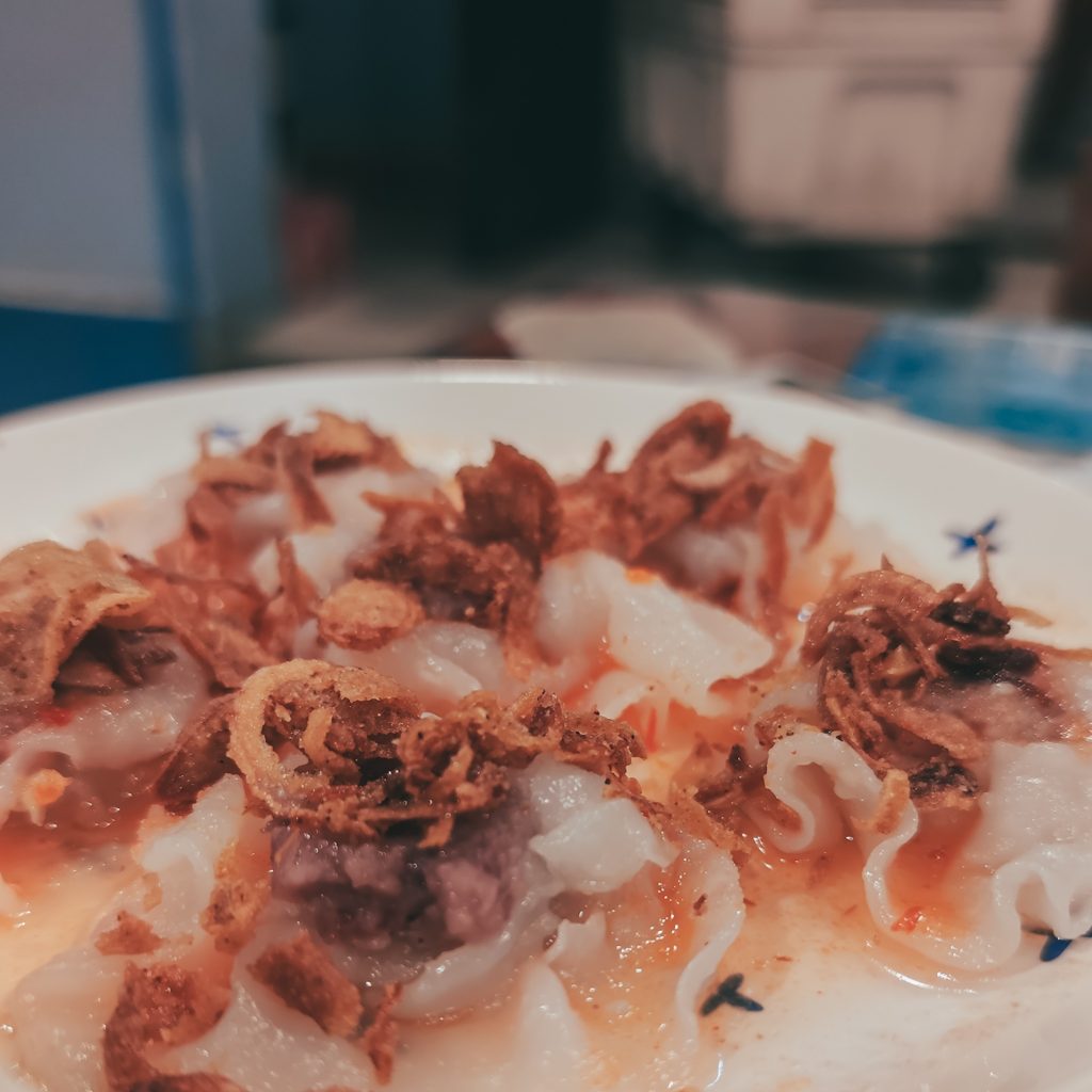 Wir stehen pünktlich zum bestellten Frühstück parat und werden in den Garten geleitet. In den Garten? Wir schauen etwas orientierungslos in das Gesicht der Tochter. Tatsächlich gibt es hinter der Küche noch einen kleinen süßen Garten in dem wir unser Frühstück serviert bekommen. Welche besondere Bedeutung das Cao lầu hat und dass es die Nudeln nur hier gibt, wird uns erst später klar, als wir googlen: Nirgends sonst haben die Nudeln die entsprechende Konsistenz, um als “Cao lầu Nudeln” durchzugehen. Das Geheimnis ist das Wasser, in dem die Reiskörner vor der Weiterverarbeitung eingeweicht werden. Es stammt von den Quellen der Cham-Minderheit rund um Hoi An. Außerdem wird mit einer speziellen Holz-Asche von den Cu Lao Cham Inseln, ca. 15 Kilometer vor Hoi An, eine Lauge hergestellt. Sie ist die Grundlage um den Nudeln eine spezielle, zähe Konsistenz zu verleihen. Für uns schmecken sie wie etwas dickere Nudeln und im ersten Moment (eigentlich auch im zweiten oder dritten..) erkennen wir nicht, dass es sich um Reisnudeln handelt.