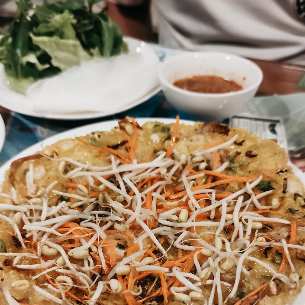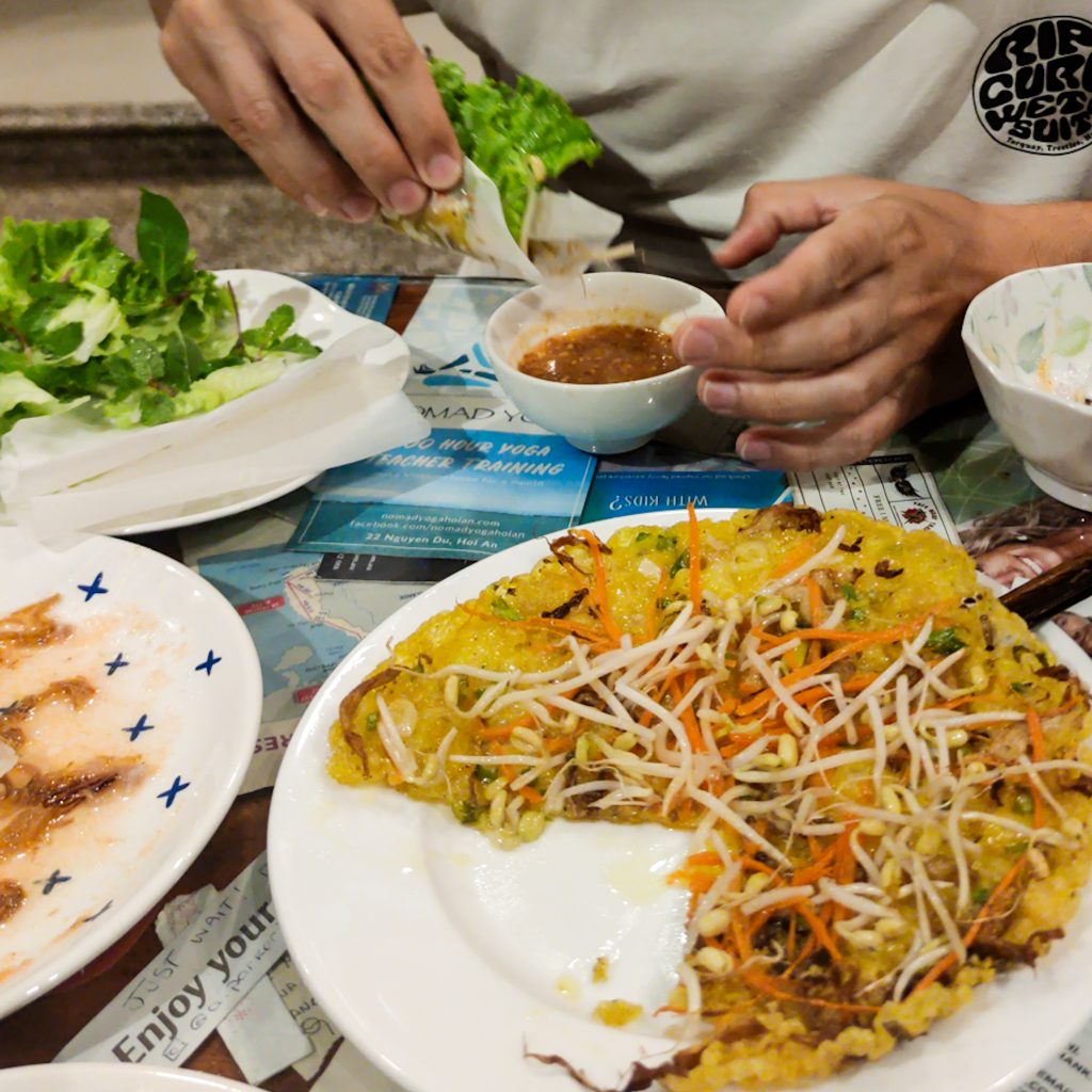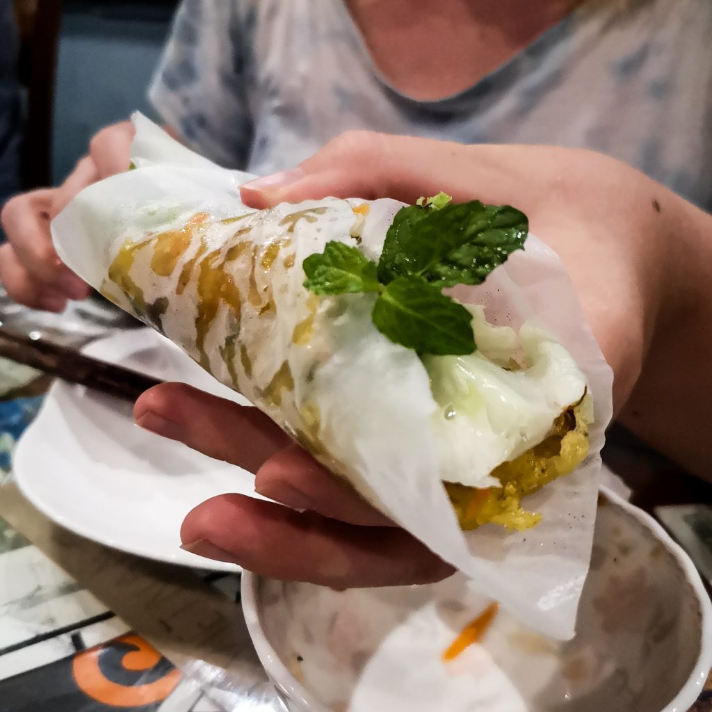Der „brutzelnde Pfannkuchen aus Vietnam“, Bánh Xèo ist nach dem zischenden Geräusch benannt, das entsteht, wenn der dünne Reismehlteig in den Wok oder in die Pfanne gegossen wird. Wörtlich übersetzt bedeutet „Bánh“ Kuchen/Brot und „xèo“ brutzeln. Das typische „xèo“, das Brutzelgeräusch entsteht durch den speziellen Teig. Im vietnamesischen Original besteht dieser nur aus Reismehl, Kokosmilch, Salz, Sodawasser und Kurkuma. Der fettige Pfannkuchen wird mit Reispapier und dem typischen Grünzeug in Form von Kräutern serviert. Man nehme das weiche Reispapier, platziere ein Stück Pfannkuchen darauf, toppe dies mit einer Hand voll Grünzeug, rollt das ganze zu einer Art Rolle und tunkt diese dann im dazu gereichten Dip. Unser Fazit: Eine etwas matschige und fettige Angelegenheit, aber die Rolle schmeckt sehr gut und wir sehen tatsächlich auch viele Einheimische, die diese Speise essen.