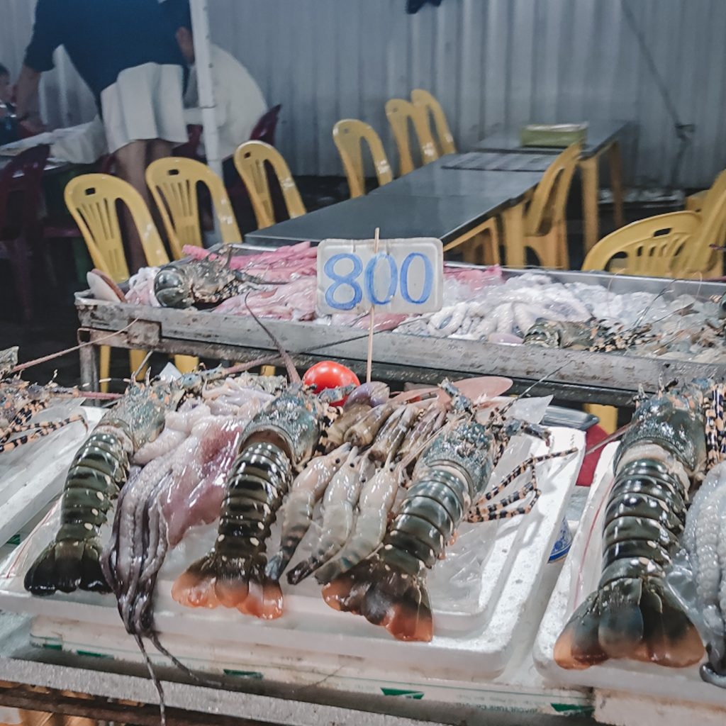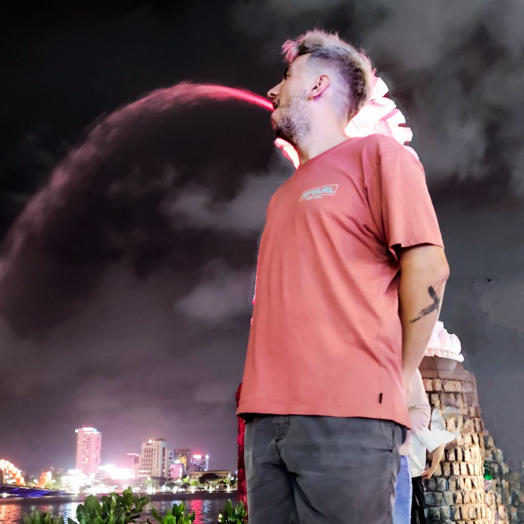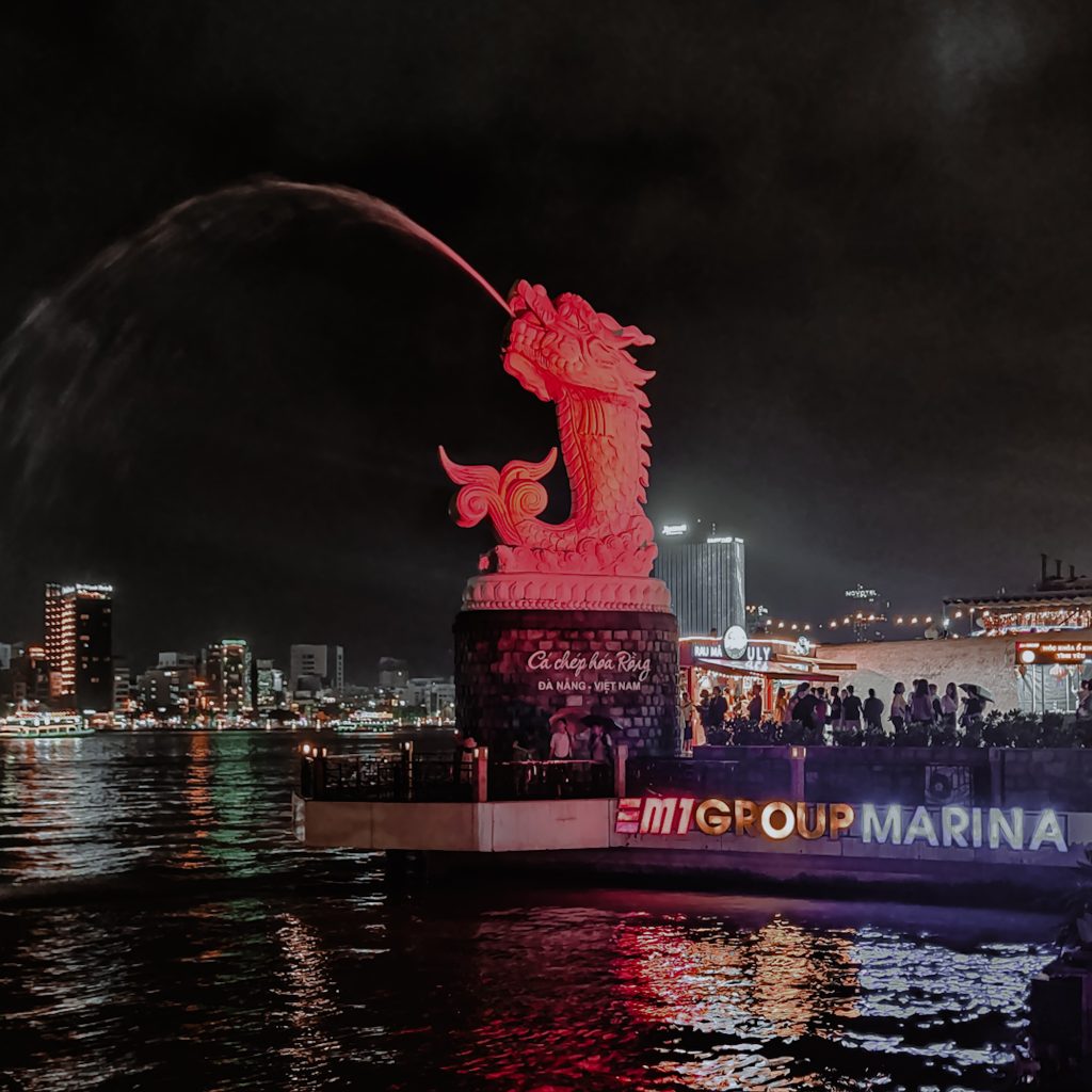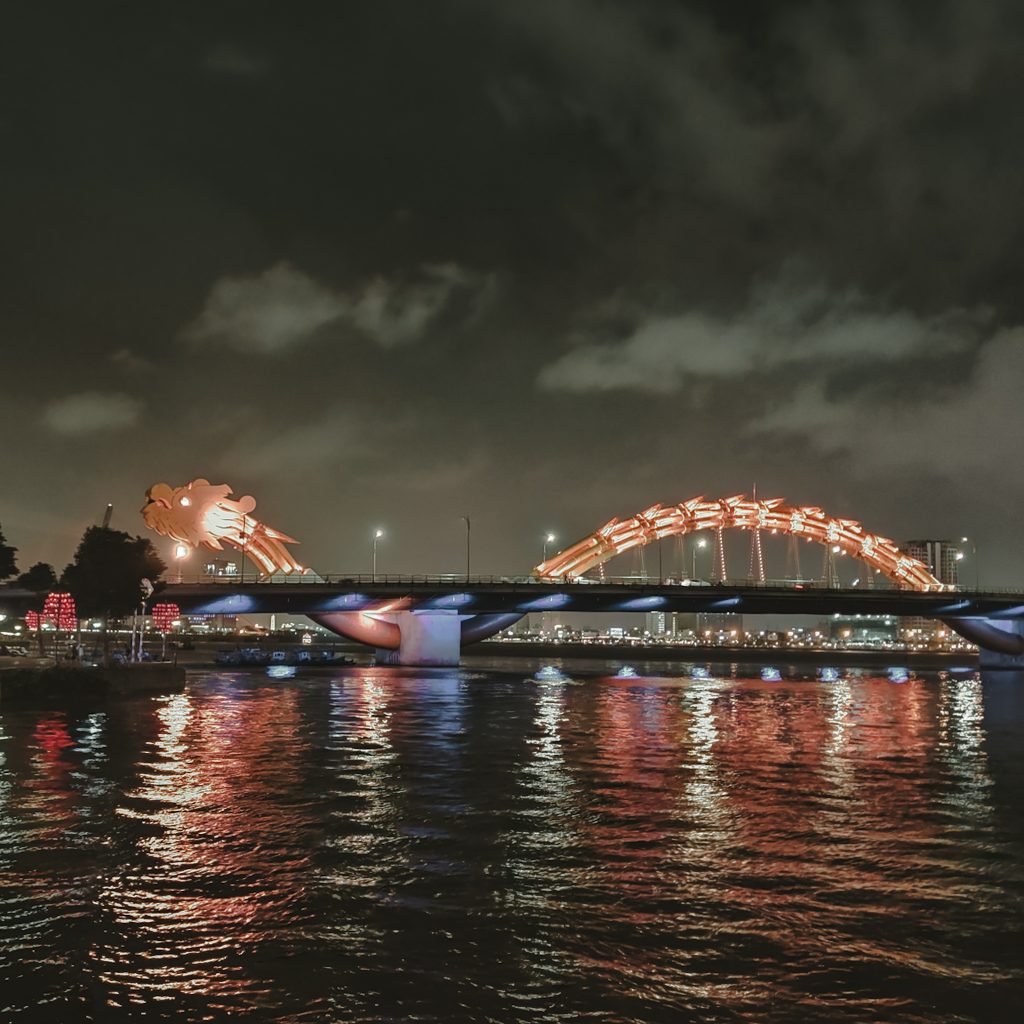 Wir kümmern uns um weitere Planungen für die kommenden Tage. Am Abend gehen wir etwas essen und laufen dann zu Fuß zur Drachenbrücke. Dabei kommen wir am Nachtmarkt vorbei uns schlendern einmal darüber. Neben dem Nachtmarkt findet eine Art kleine Messe mit Bühnenshow statt. Knapp bekleidete Frauen tanzen auf der Bühne und im Anschluss übernimmt eine Sängerin im knappen Kleid. Später folgt noch ein Gewinnspiel mit dem Publikum – hierbei sollen Destinationen anhand von Fotos erraten werden. Wir schauen es uns aus sicherer Entfernung an, die Lautstärke ist im wahrsten Sinne des Wortes ohrenbetäubend. So kann ein bisschen echte vietnamesische Kultur ja auch aussehen.