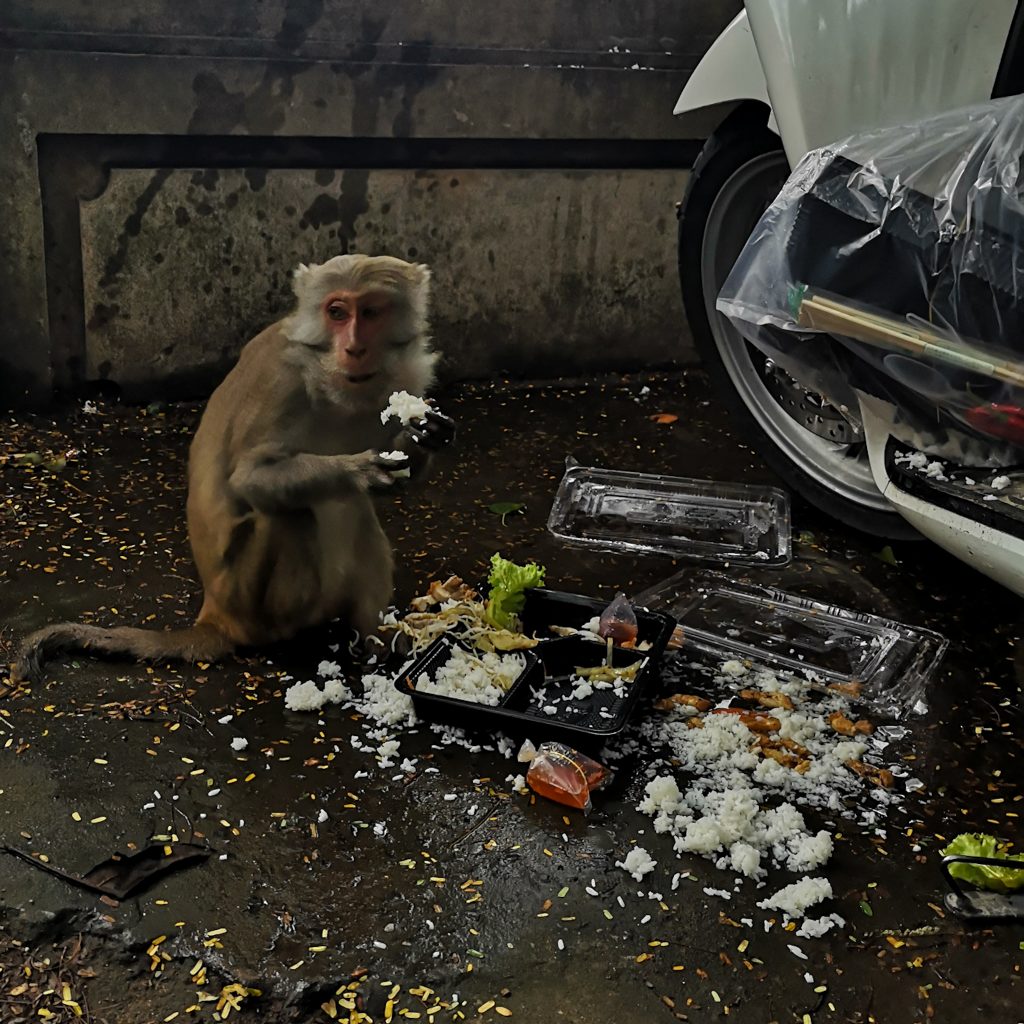 Bevor wir allerdings die Bekanntschaft von Lady Buddha machen, begegnen wir anderen tierischen Zeitgenossen. Der Berg auf den wir gerade gefahren sind, bzw. die gesamte Gegend um uns herum wird auch „Monkey Mountain“ genannt. Auf dem Roller-Parkplatz ist ganz schön was los. Ein Affe hat den Fund des Tages gemacht. Unachtsame Besucher:innen haben ihr in Plastiktüten verpacktes Mittagessen am Roller hängen lassen. Ein Affe freut sich über diese kostenfreie Lieferando-Lieferung bis vor die Haustüre und macht sich genüsslich über alle Speisen her. Der gesamte Roller-Parkplatz ähnelt eher einem kleinen Affen-Spielplatz: Die Affen sitzen auf den Rollern, spielen an den Rückspiegeln herum und tollen in liegengelassenen Regenschirmen herum. Wir lassen das tierische Entertainment hinter und widmen uns nun der Beschützerin von Đà Nẵng.