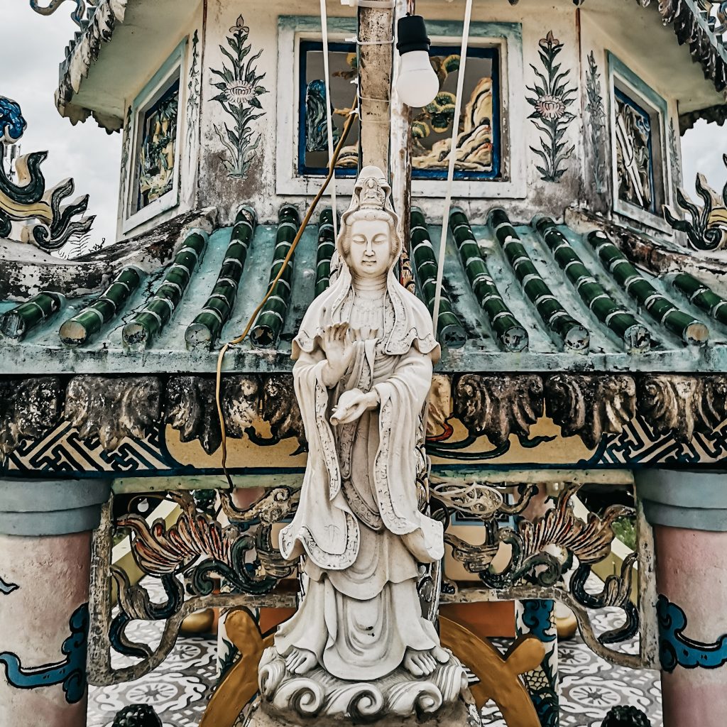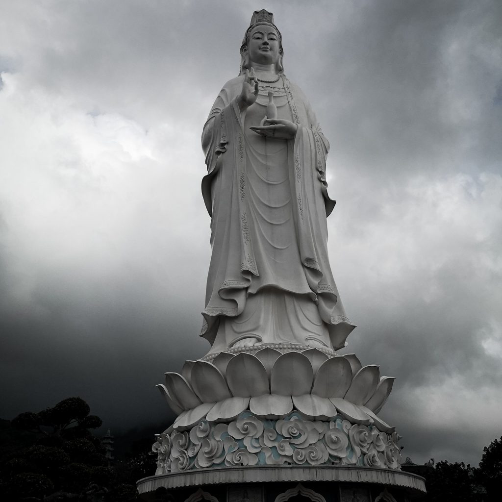 Lady Buddha ist wahrhaftig riesig, mit ihren 67 m ist sie aus der Stadt gut zu sehen und wirkt jetzt logischerweise noch riesiger. Sie ist die Beschützerin von Đà Nẵng, da sie die Kräfte besitzt, mögliche Taifune, die die Stadt bedrohen, in eine andere Richtung zu lenken. Darüber hinaus wird die für ihre Liebe zu den Menschen hoch verehrt. In ihrer rechten Hand hält sie eine Wasservase, die den Nektar des Lebens enthält, und in ihrer linken Hand einen Weidenzweig, mit dem sie den Nektar auf die Gebete sprenkelt. Für die Fischer ist sie auch eine Schutzpatronin, die ihnen auf dem Meer folgt, Glück schenkt und sie rettet. Deshalb kommen sie zum Beten, bevor sie in See stechen. Direkt zu ihren Füßen stehen viele Bonsai-Bäume als Wertschätzung und Verehrung ihrer Person. Einer Legende zufolge war Kwan Yin, die oft als der weibliche Buddha bezeichnet wird, eine schöne indische Prinzessin, die die Ehe und das gute Leben aufgab, um in einem Kloster zu leben und ein wahrhaft erleuchtetes menschliches Wesen, einen Bodhisattva, zu werden.