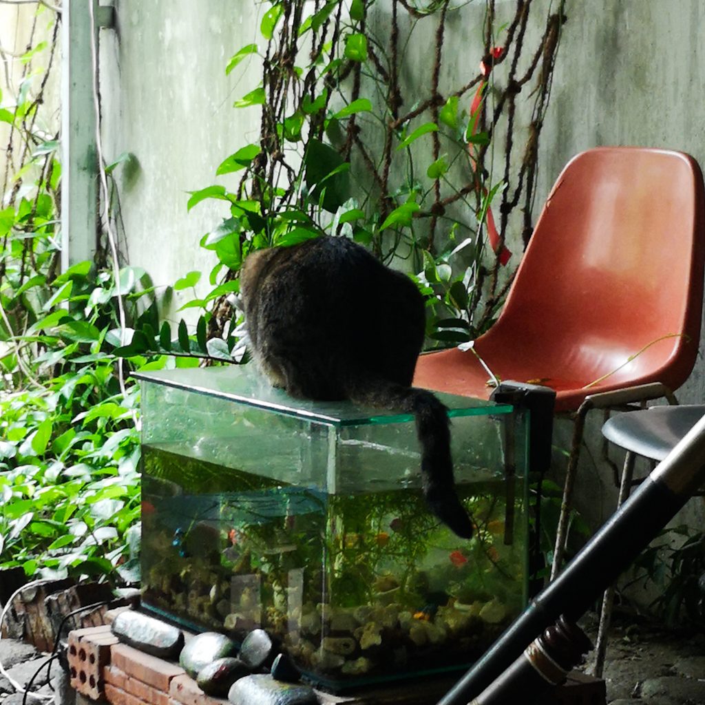 Im kleinen Café sind wir die einzigen Gäste. Wir werden von zwei kleinen Hunden begrüßt. Alles ist etwas „selfmade“ und hat seinen ganz eigenen Charme. Wir fühlen uns direkt wohl und kommen mit den zwei Frauen ins Gespräch. Sie sind richtig nett und interessiert, was wir noch für Pläne haben und geben uns Tipps, was wir uns noch in der Umgebung anschauen können. Das meiste haben wir allerdings schon abgehakt. Die Tiere sind hier übrigens in der Überzahl. Neben den beiden kleinen Hunden gibt’s auch noch ein paar Katzen und Fische. Die Katzen haben die beiden Frauen gerettet und eine davon ist einfach riiiesig. Sie scheint aber keine Tötungsabsichten uns gegenüber zu haben und leistet uns Gesellschaft. Wo sie übrigens auch noch gerne chillt: Auf dem Aquarium. Ein wirklich guter Spot zum Fernsehen.