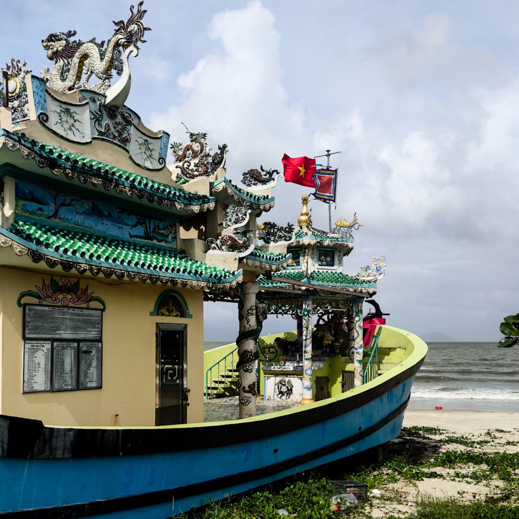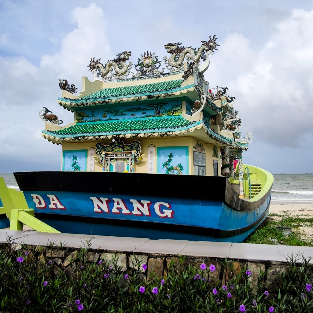 In einem Reiseblog sind wir auf diesen kleinen Tipp gestoßen. Zum Schutz der Fischer wurde eine kleine Pagode auf ein Schiff gebaut, welches direkt am Strand steht. Wir statten diesem Ort einen kleinen Besuch ab. Es sieht tatsächlich ganz lustig aus und passt sehr gut zu Đà Nẵng. Und wenn wir gerade schon hier in der Ecke unterwegs sind, halten wir noch kurz an der Kirche, die ebenfalls als Sehenswürdigkeit angegeben wird. Dieses Exemplar ist zwar von außen ganz nett, haut uns aber weniger vom Hocker. Aber gut, Kirchen kennen wir ja zur Genüge. Ganz im Gegensatz zu Pagoden auf Schiffen, daher geht der Punkt eindeutig an die Fischer Pagode.