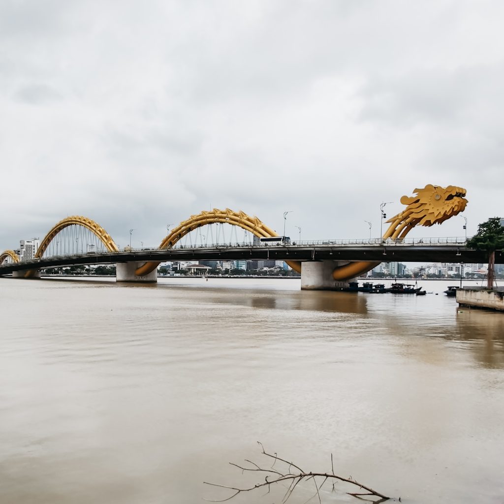Da wir noch nicht einchecken können, beginnen wir mit einem kleinen Spaziergang. Erst geht es zum Meer und von dort zum ersten Wahrzeichen der Stadt: der Drachenbrücke namens Cầu Rồng. Woher dieser Name kommt, ist schnell offensichtlich. Der Drachenkopf speit üblicherweise an Samstag- und Sonntagabenden drei Minuten lang Feuer, gefolgt von einem Schwall Sprühregen und die gesamte Brücke ist am Abend schön beleuchtet. Bei unserem ersten Besuch ist sie deutlich weniger spektakulär und geht aus dem Mix von dreckigem grauen Flusswasser und dem grauen Himmel unter. Wir machen noch kurz Halt in einem Café und erkunden ein bisschen die Straßen und das Viertel in der Nähe unseres Hotels. Ja, richtig gehört, die kommenden beiden Tage nächtigen wir in einem richtigen Hotel.