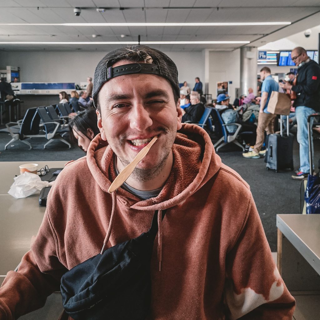 Wir können ohne jegliche Zurechtweisung den Sicherheitsbereich betreten und unsere restliche Zeit am Flughafen totschlagen. Denn wir haben Pläne: Noch haben wir fünf Voucher à 15 Dollar, die wir auf den Kopf hauen müssen. Unser Ziel: Erst überteuert frühstücken und uns vom Rest noch zwei überteuerte Kaffees kaufen. Wenn ihr jetzt denkt: Wow, mit 75 Dollar steht euch die Welt offen, damit könnt ihr euch noch ein Glas Champagner zum Frühstück gönnen… Liegt ihr leider falsch. Hier ist alles wahnsinnig teuer, klar, wir sind am Flughafen. Nachdem wir alle möglichen Frühstückslokalitäten, die weitestgehend übrigens alle fast das gleiche anbieten, abgeklappert haben, entscheiden wir uns. Es gibt ein Omelett mit Spinat und Pilzen und einen Frühstücks-Burrito, beides mit Kartoffeln. Lecker ja, aber 45 Dollar lecker? Eher nicht. Ohne diese Voucher hätten wir das Geld natürlich niemals ausgegeben.