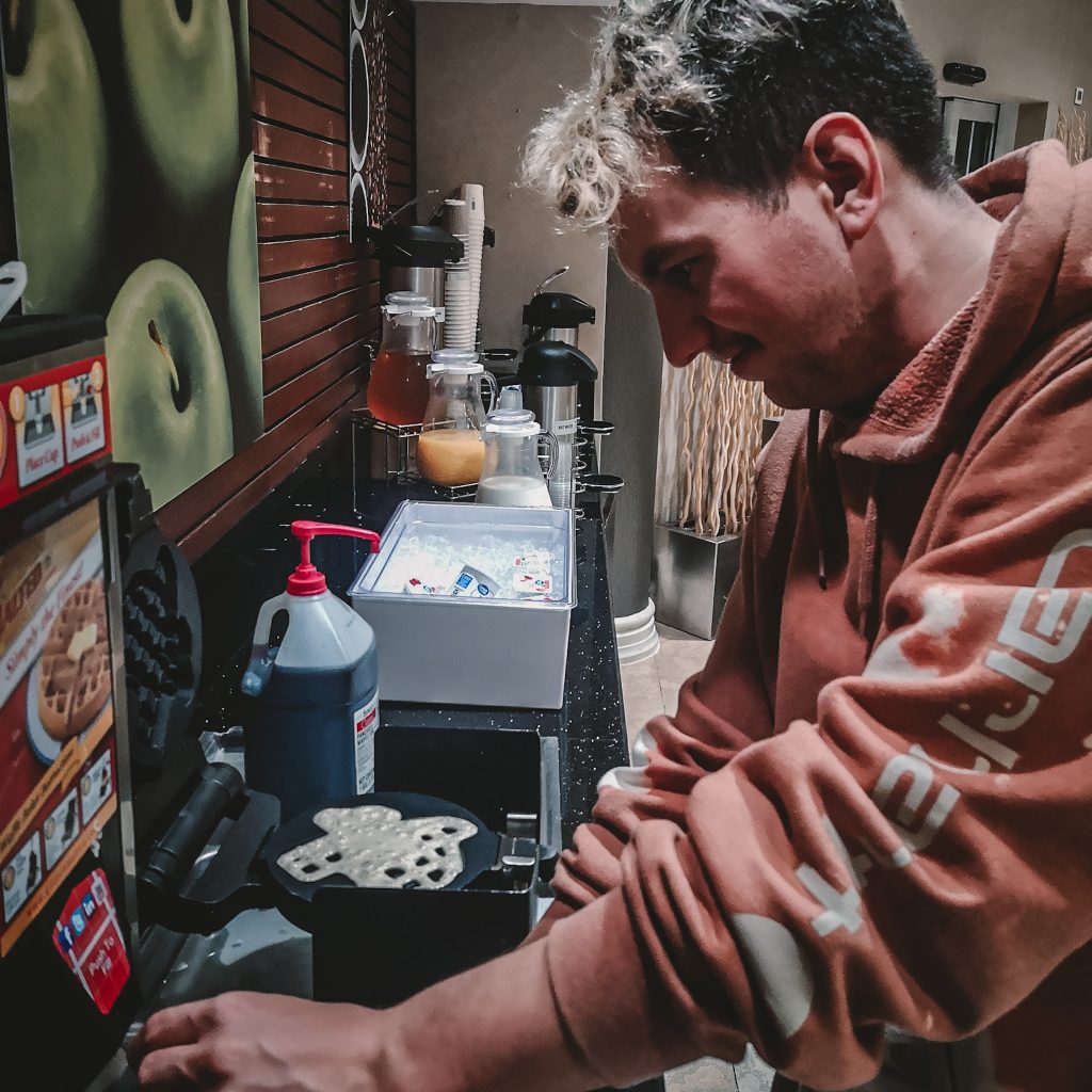 Da Konstis Handy die Uhrzeit noch nicht aktualisiert hat, geht er zu dem Zeitpunkt noch davon aus, dass wir es uns tatsächlich, zumindest für gute zwei Stunden im Bett bequem machen könnten. Es ist allerdings schon kurz vor 6 Uhr, hinlegen wäre wahrscheinlich fatal. Konsti bringt die Kaffeemaschine in Gang, während Caro das passende TV Programm sucht: James Bond (Konsti ergänzt – In tödlicher Mission). Sicherheitshalber stellen wir unsere Wecker, aber wir bleiben tatsächlich wach und machen uns um kurz nach 7 Uhr auf zum Frühstück in die Hotellobby. Das Hotel ist sehr einfach, umso erstaunter sind wir vom Frühstücksbuffet. Es gibt Kaffee, Saft, Toast, Rührei, etwas Belag, Cornflakes, Joghurt, Äpfel und eine kleine Muffin-Auswahl. Das Highlight: zwei Waffelmaschinen, mit denen wir uns zwei frische Waffeln mit Ahornsirup zaubern. Und ja, das Frühstück ist alles andere als gesund und erfüllt natürlich wieder jegliche amerikanische Klischees. Für uns ist es gerade ein kleines Schlaraffenland.