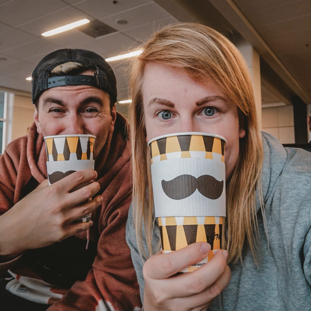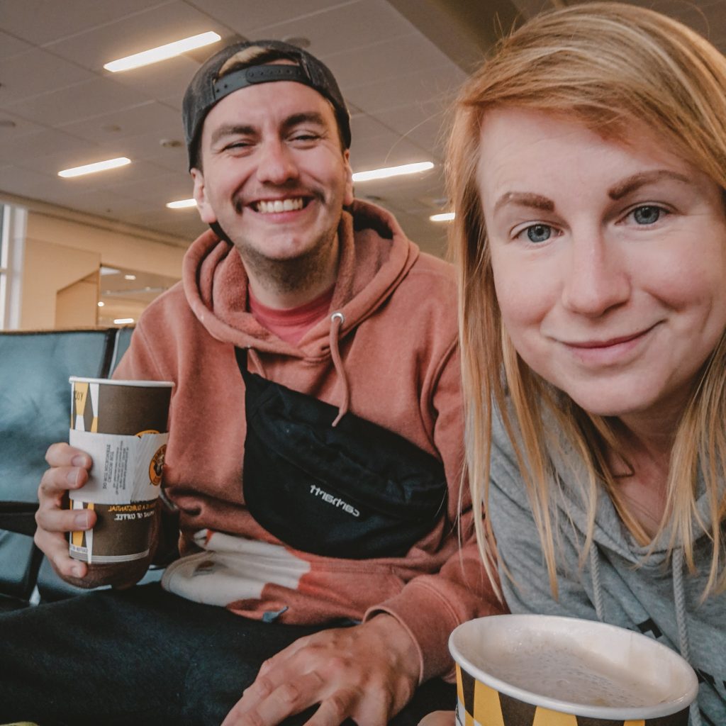 Wir stiefeln also nach unten und suchen die Bushaltestellen. Langsam wird Caro unruhig. Was, wenn es zeitlich jetzt doch eng wird und wir uns keinen Kaffee mehr holen können? Das wäre katastrophal. Wir fragen uns durch und werden immer weiter nach vorne geschickt. Es kommt ein Shuttle nach dem nächsten, aber keiner fährt Terminal E an. Geduld ist nach so viel Schlafentzug in Kombination mit Zeitumstellung nicht unsere (husthusthust Caros) Stärke. Nicht auszudenken, wie hier die Situation mit zwei (ok, eigentlich nur mit einem) leeren Magen aussehen würde. Natürlich kommt irgendwann doch ein Bus und dieser bringt uns auf direktem Weg zum Terminal E, Eingang 25, wo wir noch vor ein paar Stunden ungeduscht, stinkig und mit leerem Magen den Flughafen verlassen haben. Mit dieser Sicht der Dinge können wir festhalten: Die Lage hat sich zum guten entwickelt. Schneller als gedacht und ohne Probleme mit unseren Boardingpässen, kommen wir in den Sicherheitsbereich. Es bleibt sogar noch Zeit, sich von den Essens-Vouchern einen überteuerten Flughafen-Cappuccino zu holen. Es scheint zu laufen.