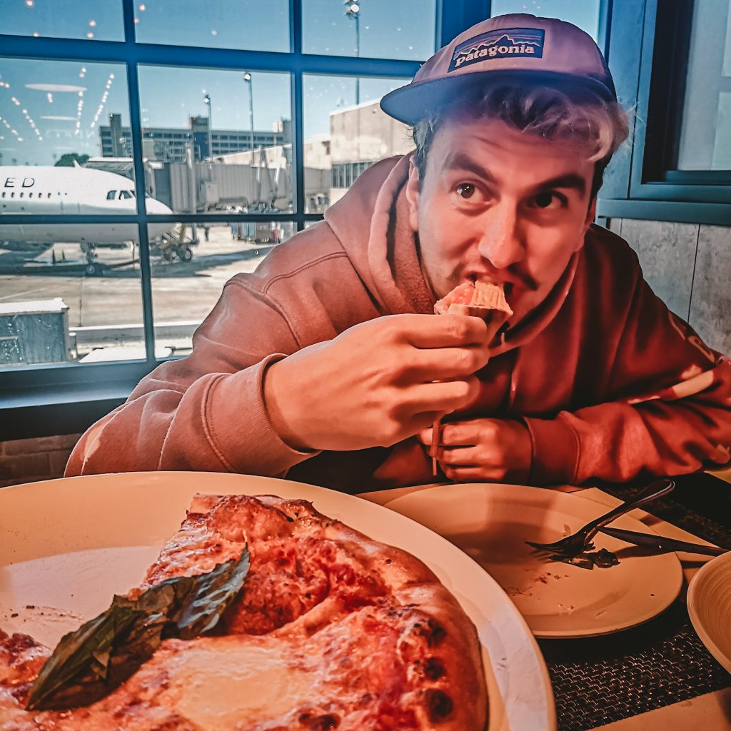 Wir sind so müde und mittlerweile auch schon wieder hungrig. Da die Essens-Voucher hier nur am Flughafen einlösbar sind, beschließen wir, dies direkt auszunutzen und bei einer Pizza und einem Salat das weitere Vorgehen zu planen.