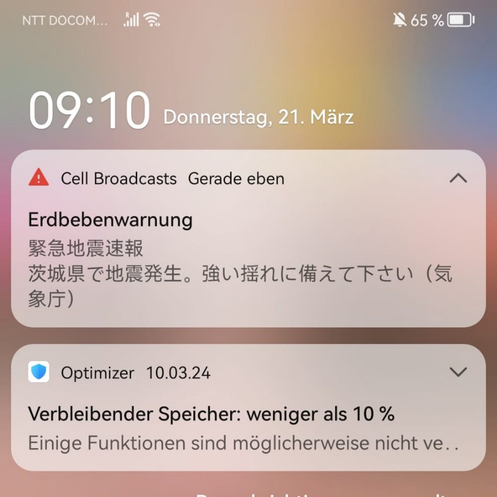 Wir bleiben noch ein paar Stunden sitzen, nutzen das Badezimmer zum Zähneputzen und zum Frischmachen. Lustigerweise gibt es hier bei den Frauen zwei Warteschlangen (natürlich, denn wir sind in Japan), eine für die Toilette und eine für den „Puder-Bereich“, in dem es fünf Spiegel-/Schminkstationen gibt. Ihr werdet es nicht glauben, aber hier ist die Schlange länger als bei den Toiletten. Nachdem wir noch eine unnötige Runde mit Gepäck durch den Bahnhof geschlendert sind, kaufen wir einen zweiten Kaffee sowie ein Frühstück. Dann verabschiedet sich Japan noch gebührend mit einem Erdbeben von uns. Caro spricht gerade den Satz „Das ist jetzt aber die Erde, die bebt, oder?“ aus, als auf den Handys sämtlicher Anwesender (und das sind in so einem großen Busbahnhof einige Leute) der Alarm losgeht. Bis auf ein paar erschrockene Gesichter bleiben aber alle recht ruhig und dann ist es auch schon wieder vorbei. Es war nicht so stark wie in der Nacht in Taiwan, aber doch deutlich zu spüren. Gut, dass wir das noch mitnehmen.