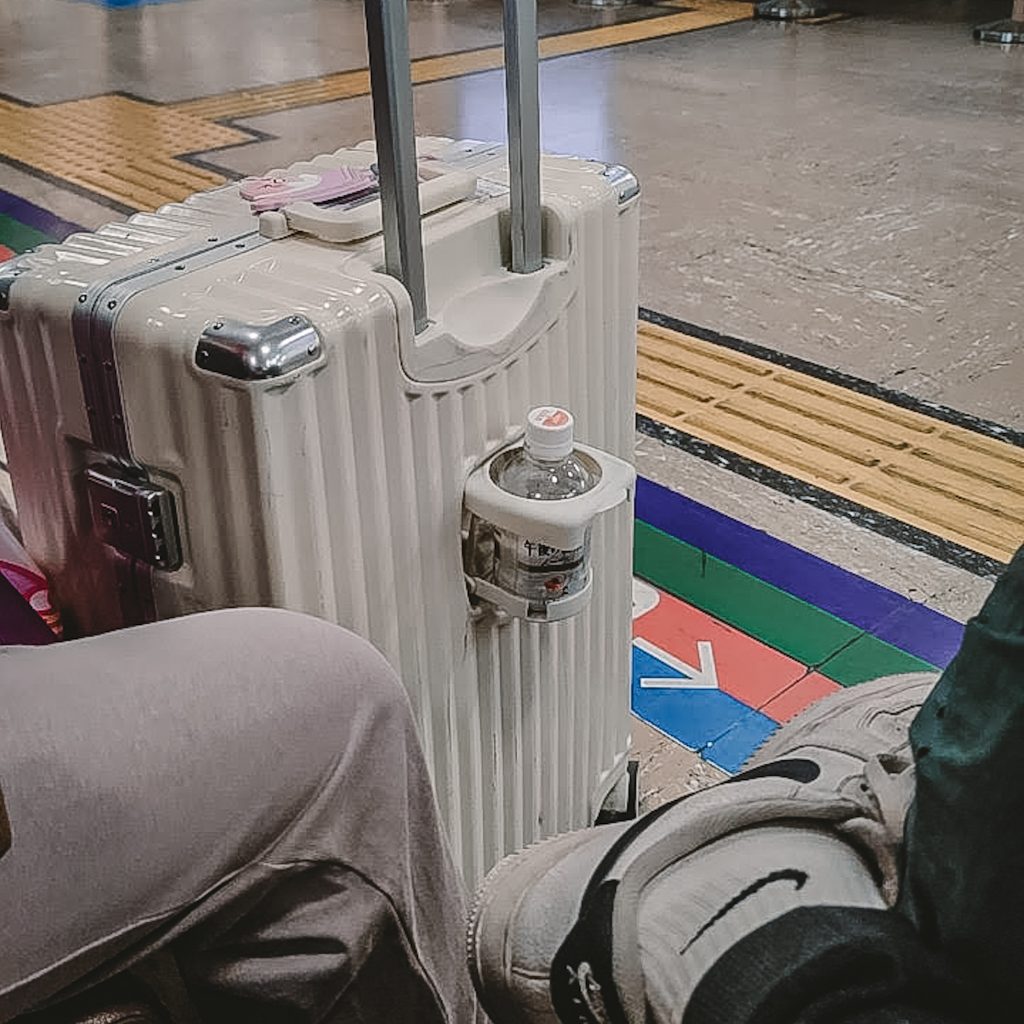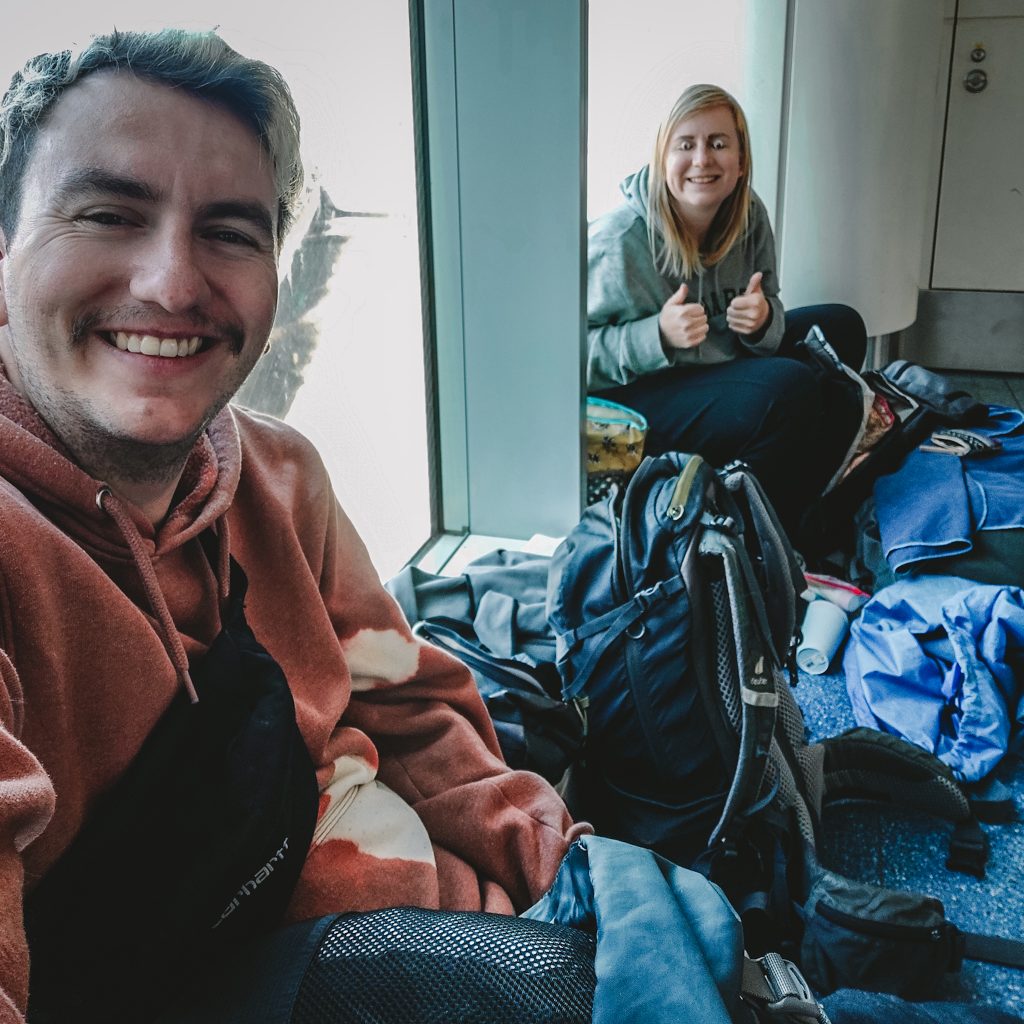 Es ist später Vormittag als wir am Flughafen Haneda ankommen. Als Erstes suchen wir uns ein gemütliches Plätzchen und packen einmal komplett unsere Rucksäcke um. Ins Handgepäck packen wir frische Unterwäsche, eine kurze Hose sowie ein Wechsel-Shirt, Handtuch, Zahnbürsten-Equipment sowie unsere kleinen Flüssigkeiten, falls unser Gepäck verloren geht oder wir aus sonstigen Gründen nicht an unser Gepäck kommen sollten. Nicht zu vergessen unsere Snacks. Wenn wir gerade schon dabei sind, flickt Caro auch direkt das kleine Loch in ihren geliebten Merino Socken – Zeit haben wir ja genug.